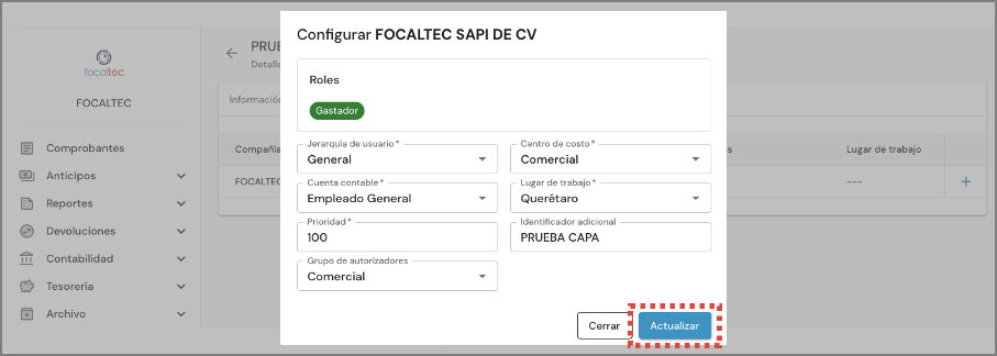 El portal te regresa a la ventana principal del Usuario donde puedes ver la siguiente información: Compañía, Jerarquía de Usuario, Centro de costo, Cuenta contable, Roles y Lugar de trabajo, además de ver una alerta “La configuración de (Nombre de Usuario) en la compañía xxxxx ha sido actualizada”.