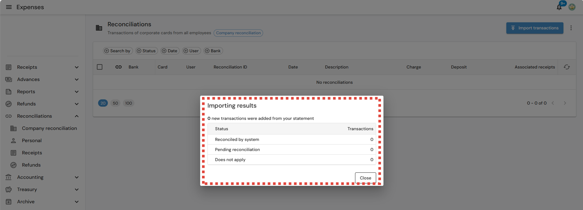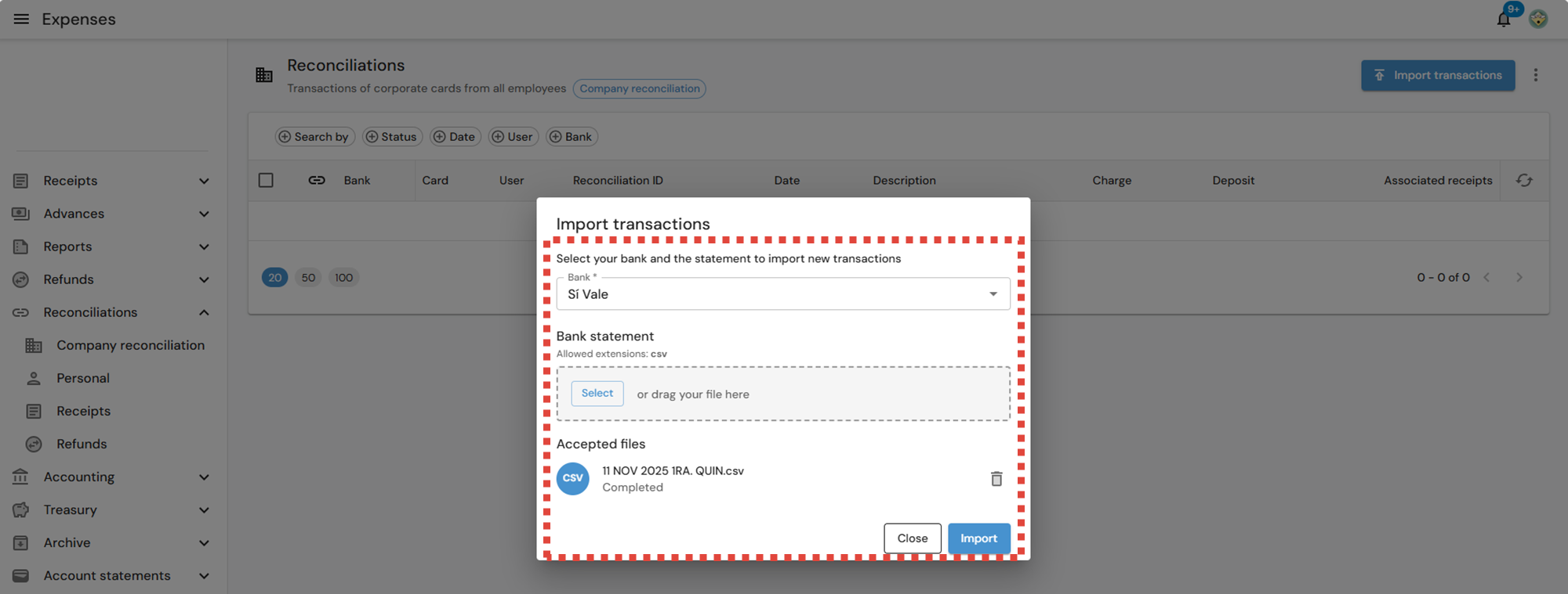 Log in to the Focaltec Control de gastos portal and select the option “Reconciliations > Company > Import transactions.”, the portal lists the transactions from the account statement that have already been added from past records.