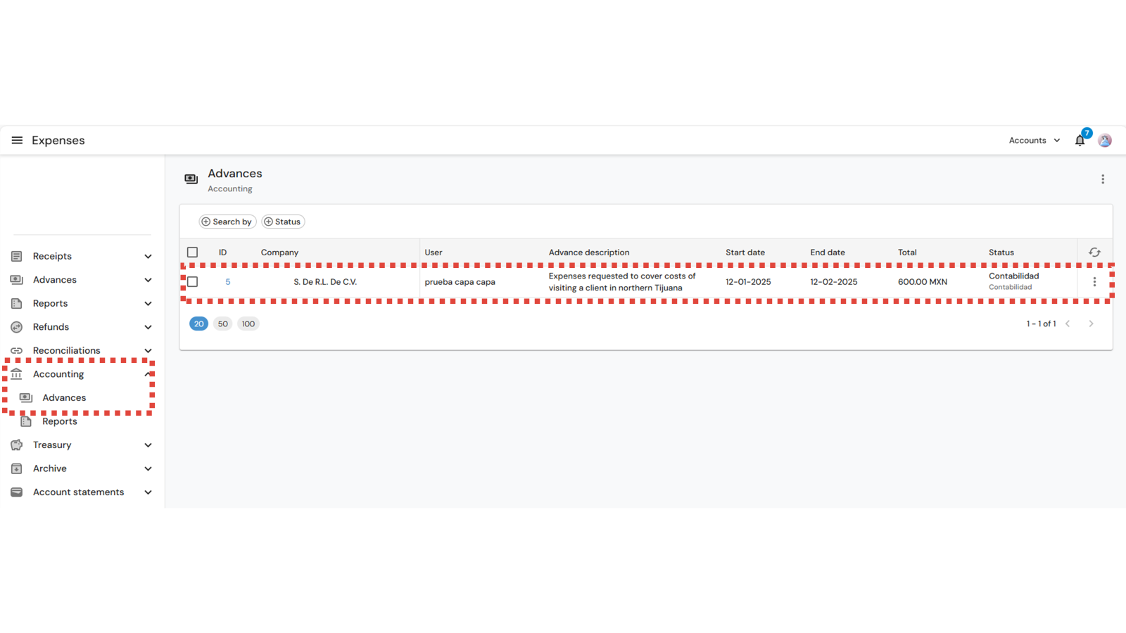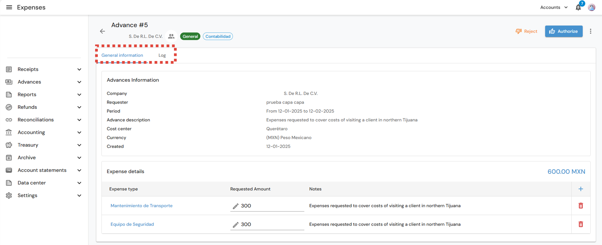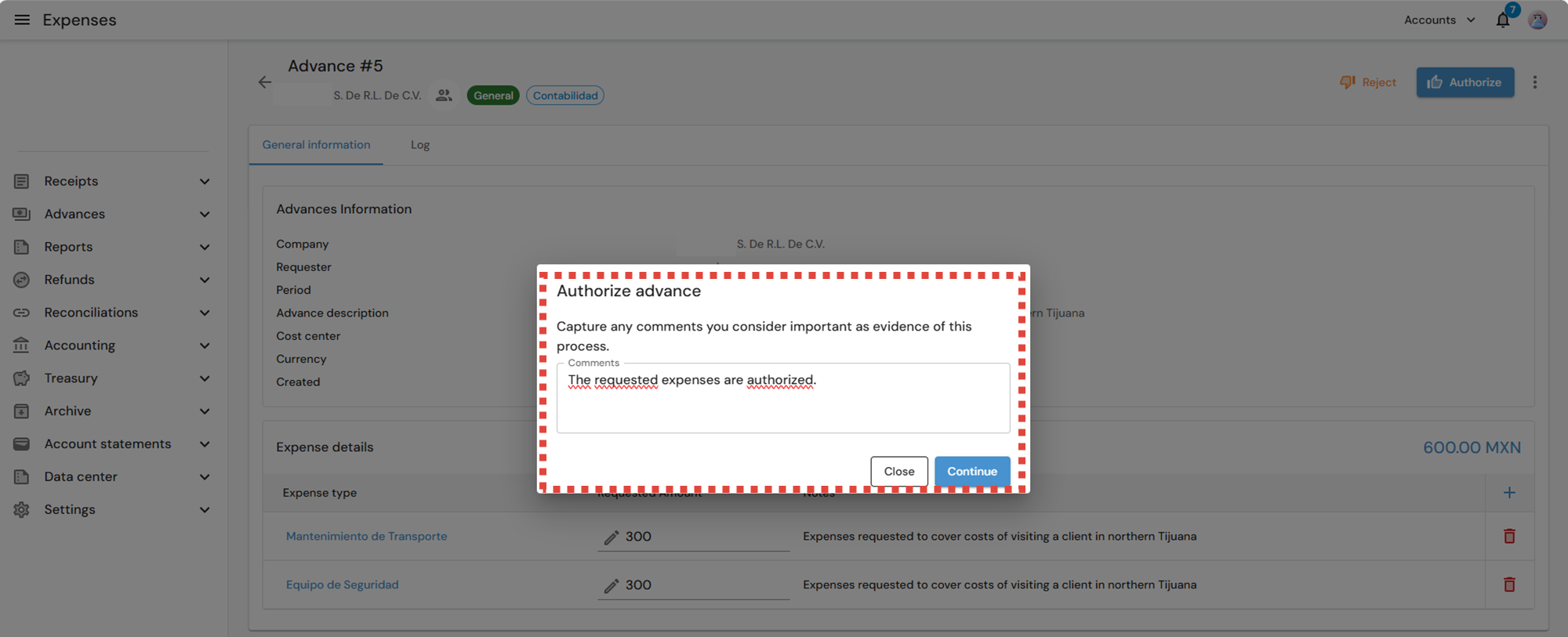 This allows you to check whether it complies with the amount established by your company's policies, as well as whether there are any notes made by the person requesting the advance payment.
