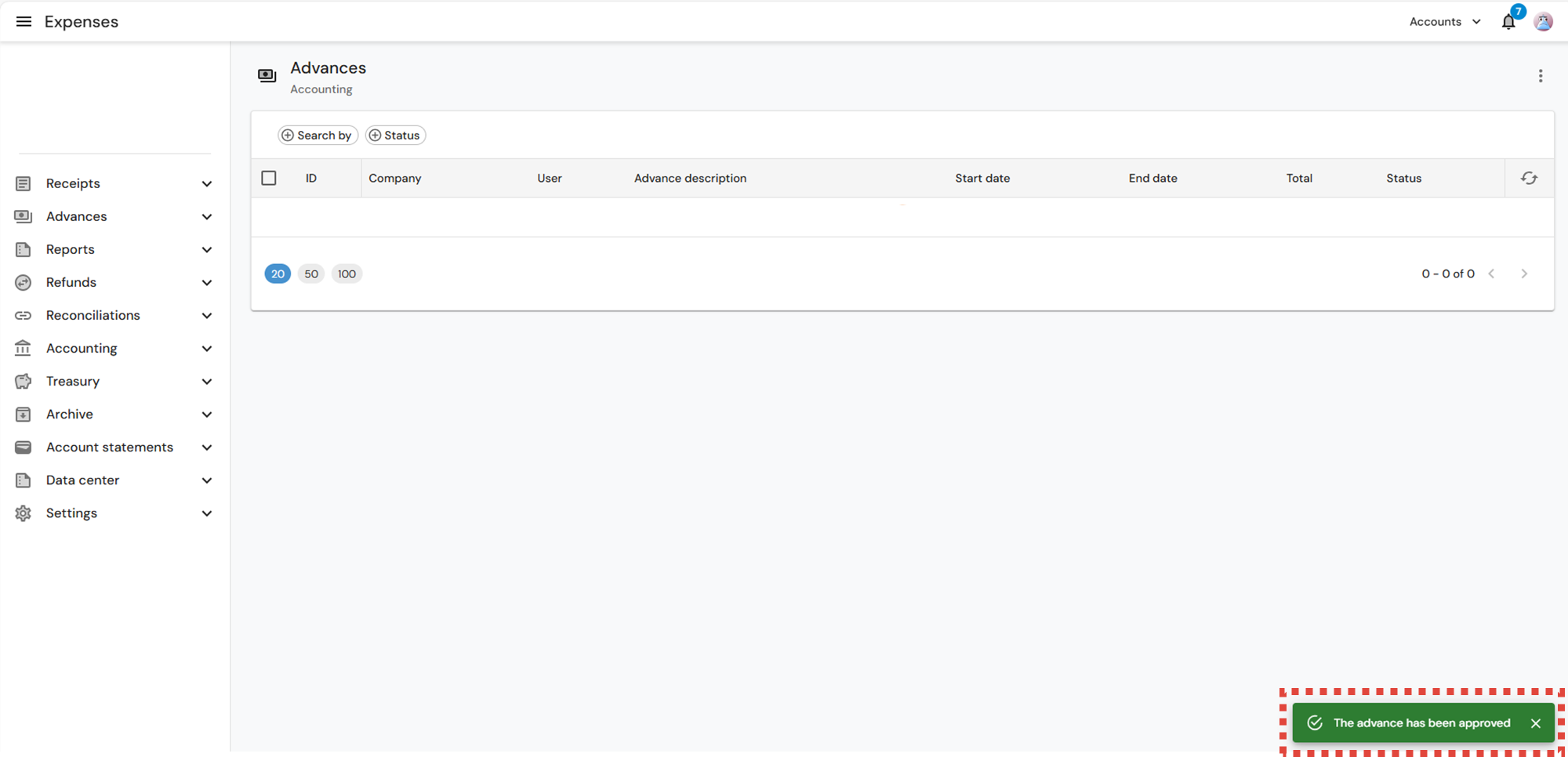 Finally, the portal issues an alert, depending on the company's workflow, the “Advance Request” will continue with further authorizations.