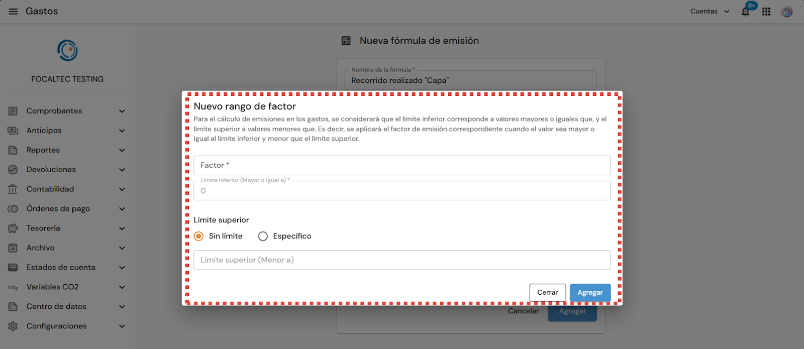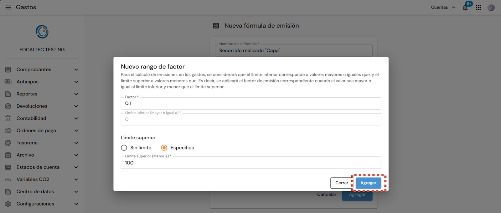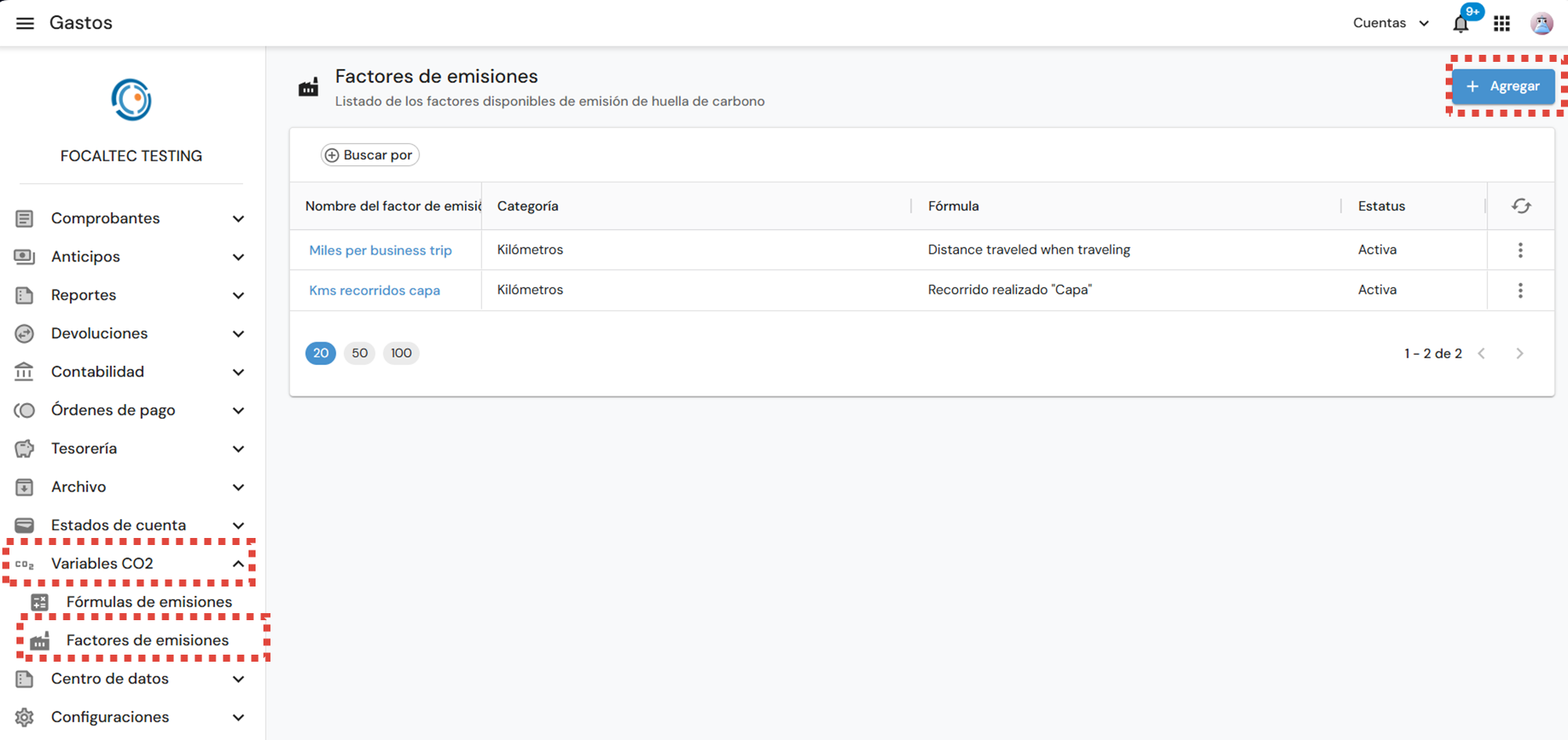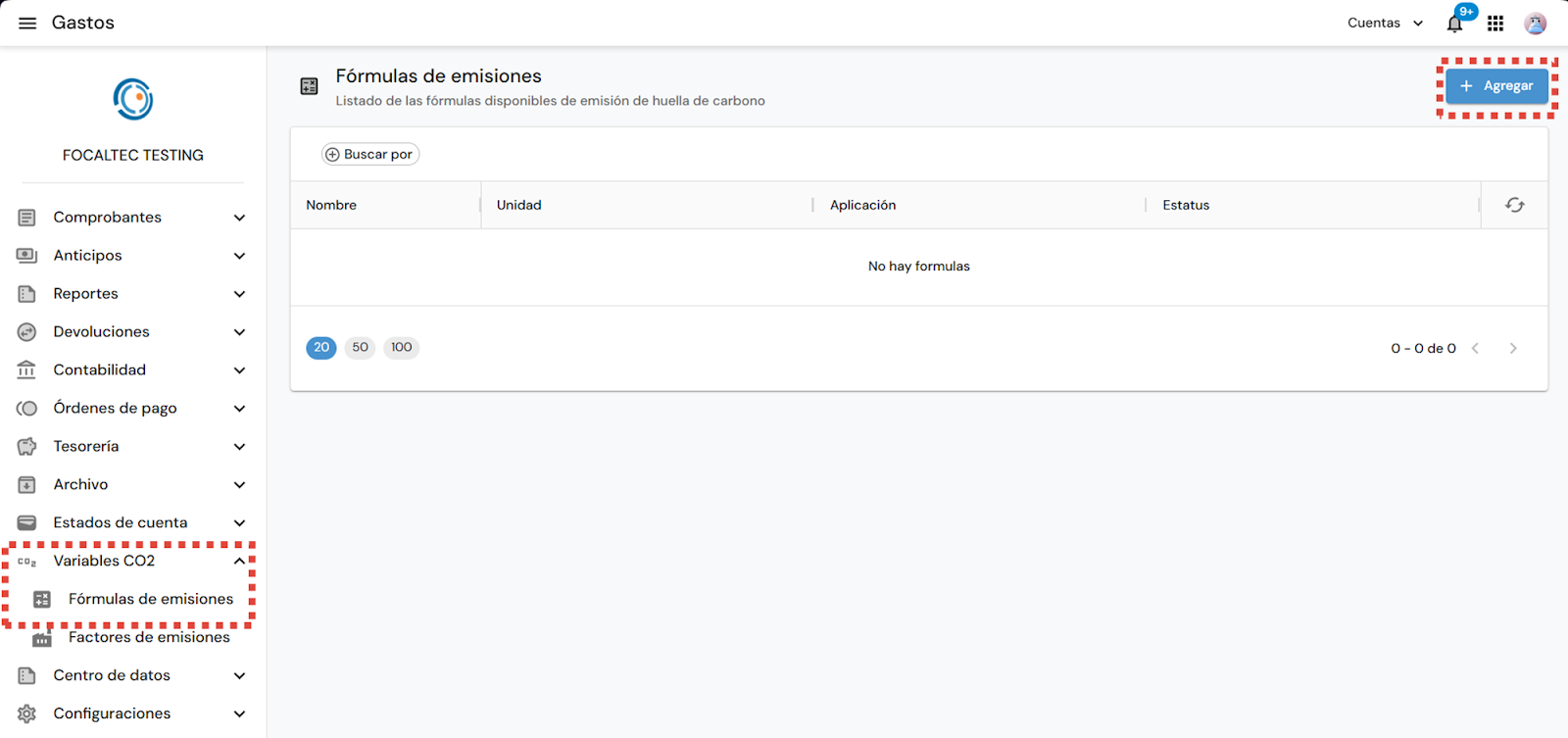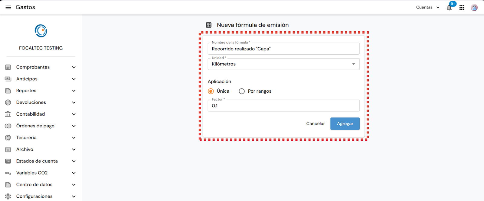 Ingresar al portal de Focaltec Control de gastos y en el menú “Variables CO2 > Fórmulas de emisiones > Dar clic en +Agregar”.