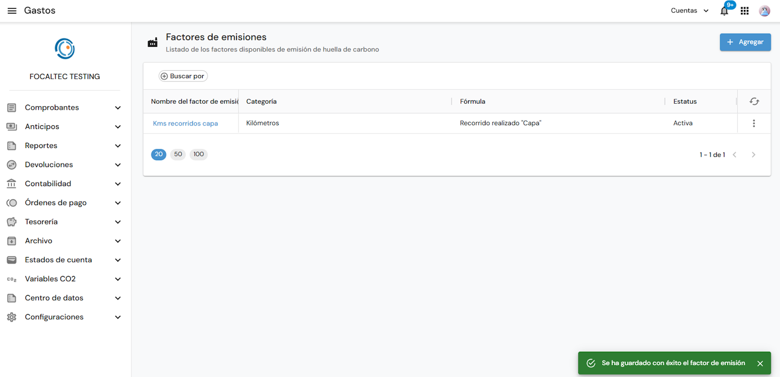 Ingresar al portal de Focaltec Control de gastos y en el menú “Variables CO2 > Factores de emisiones > Dar clic en +Agregar”.