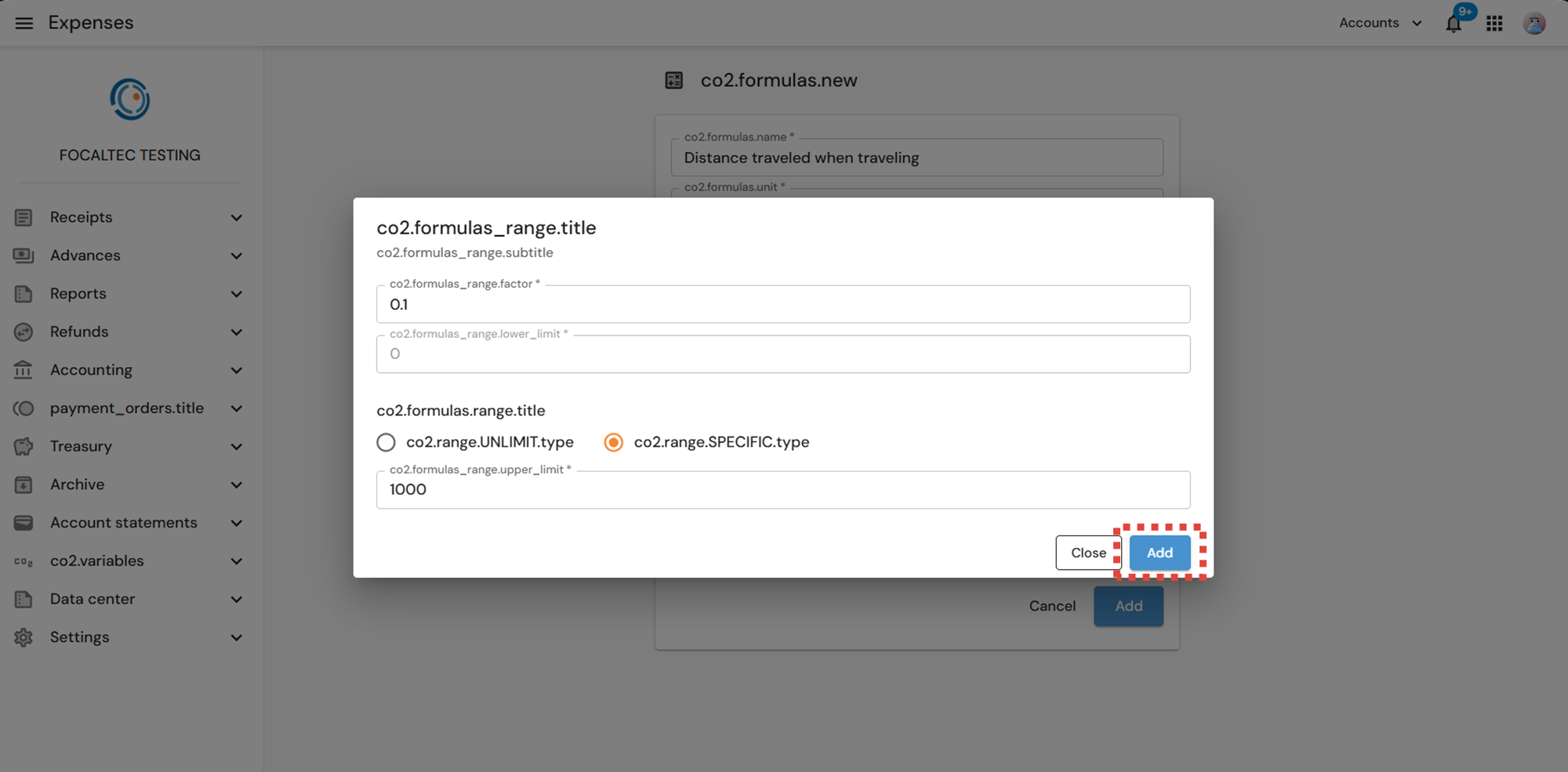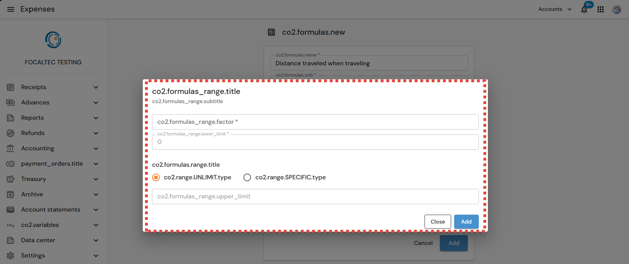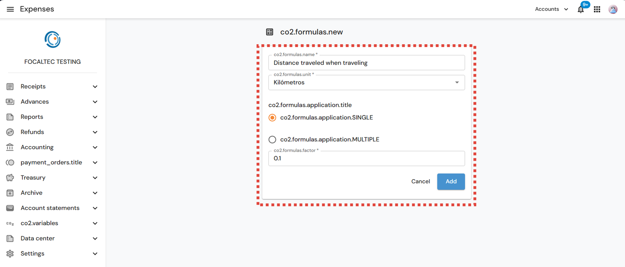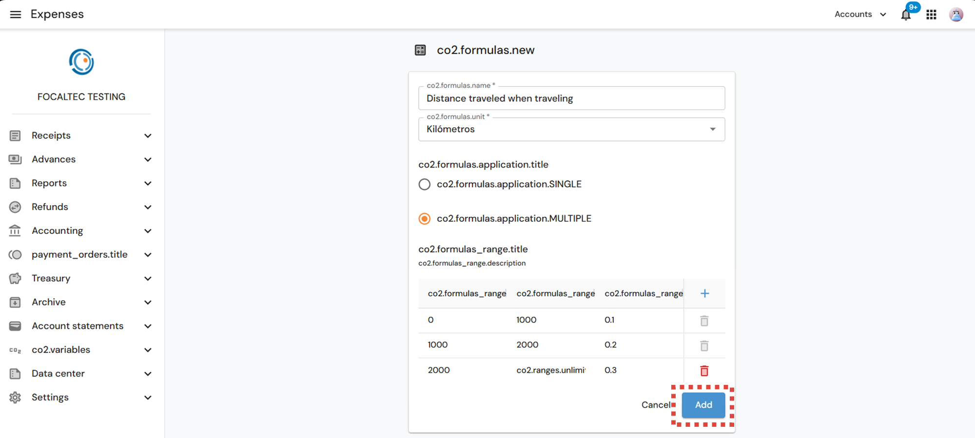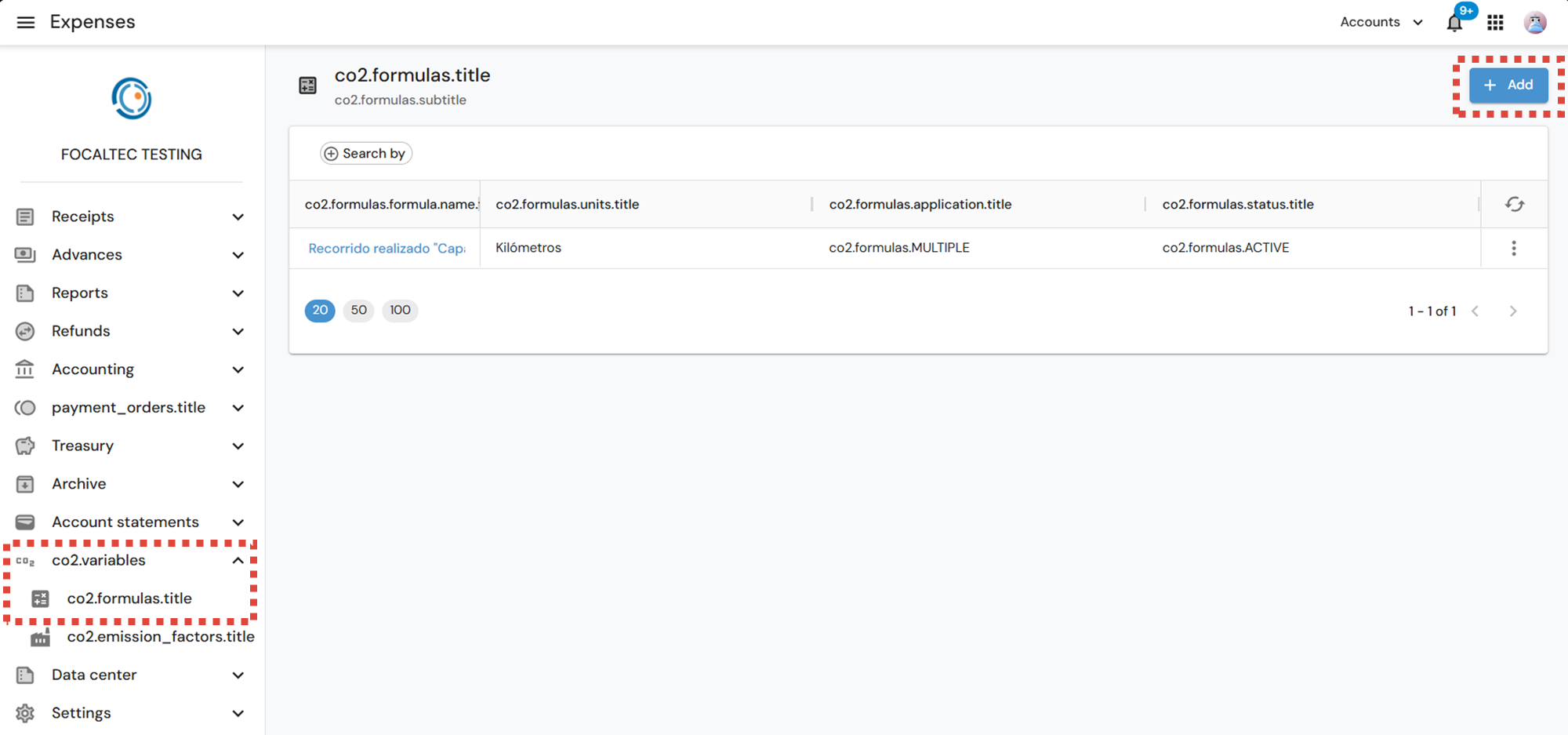 Log in to the Focaltec Control de gastos portal and, in the “CO2 Variables > CO2 formulas” menu, click on “+Add”.