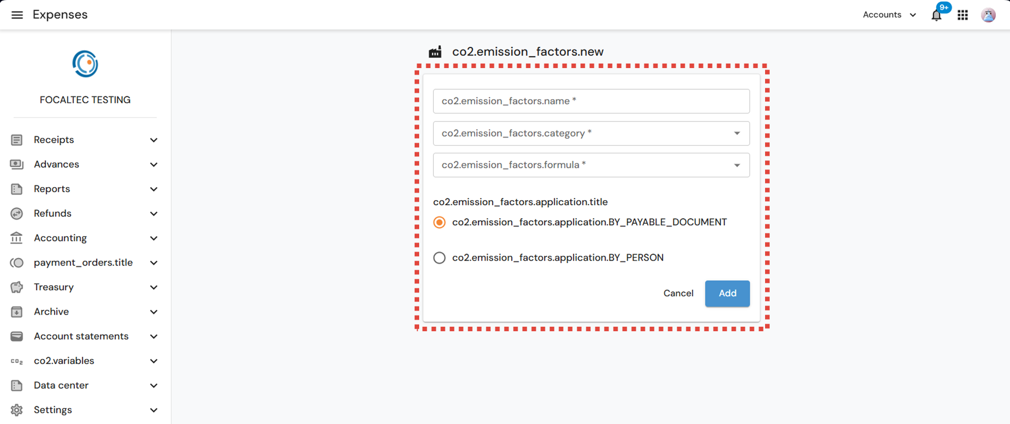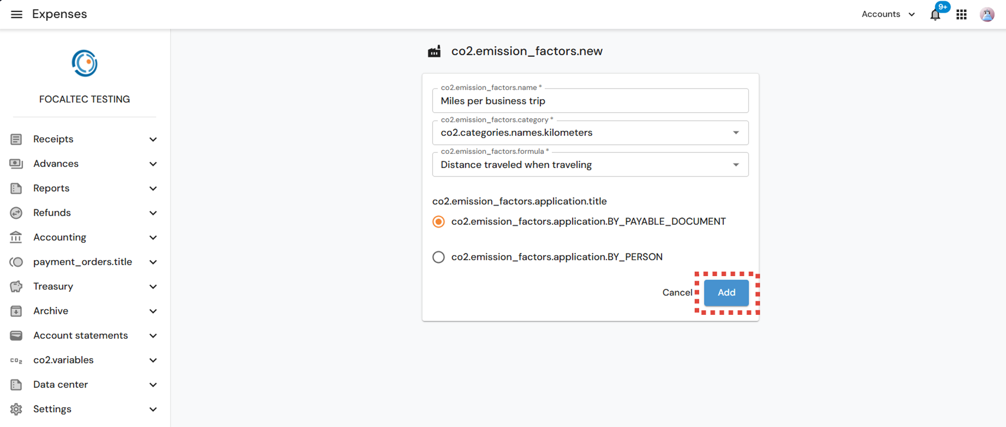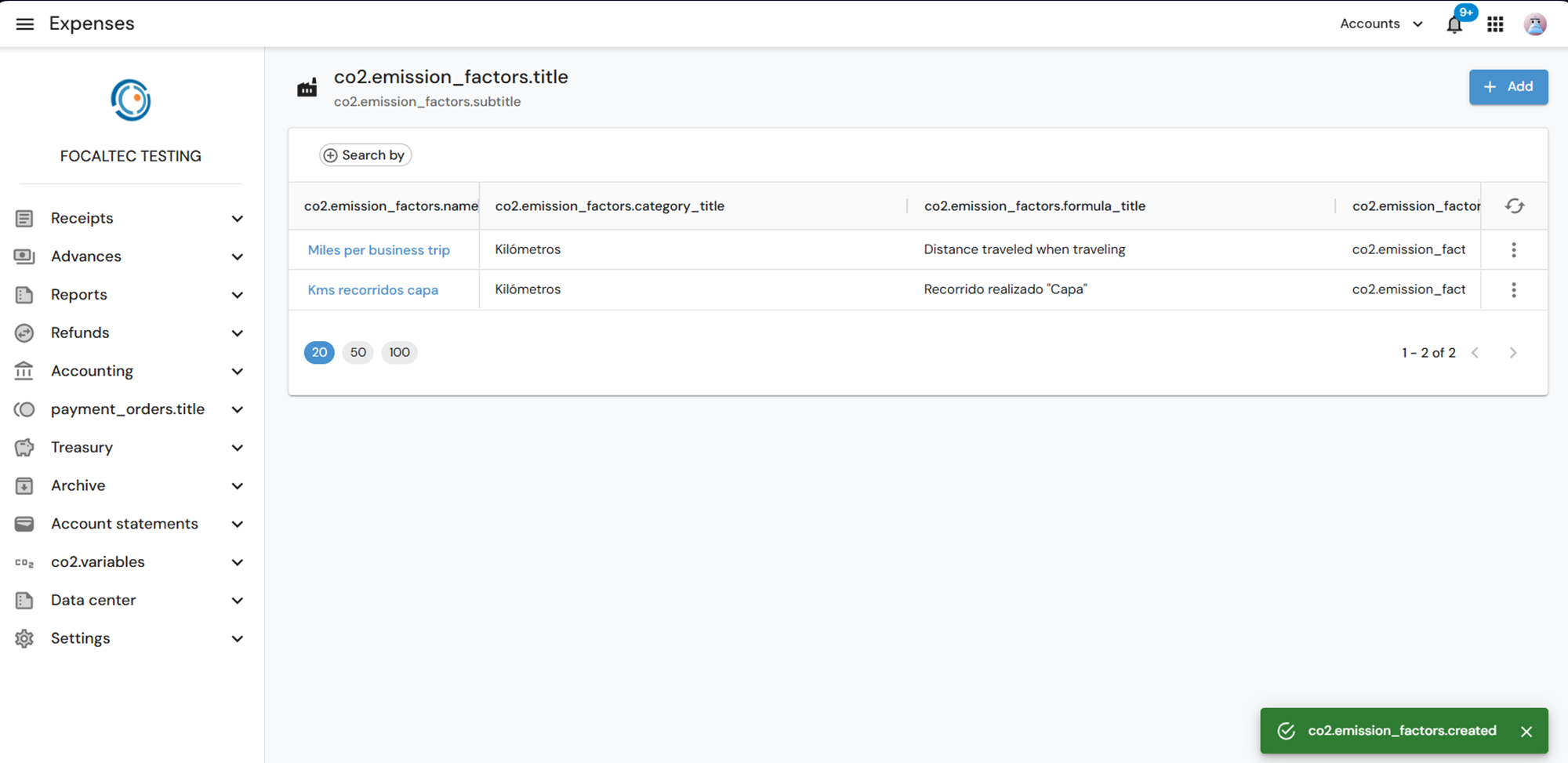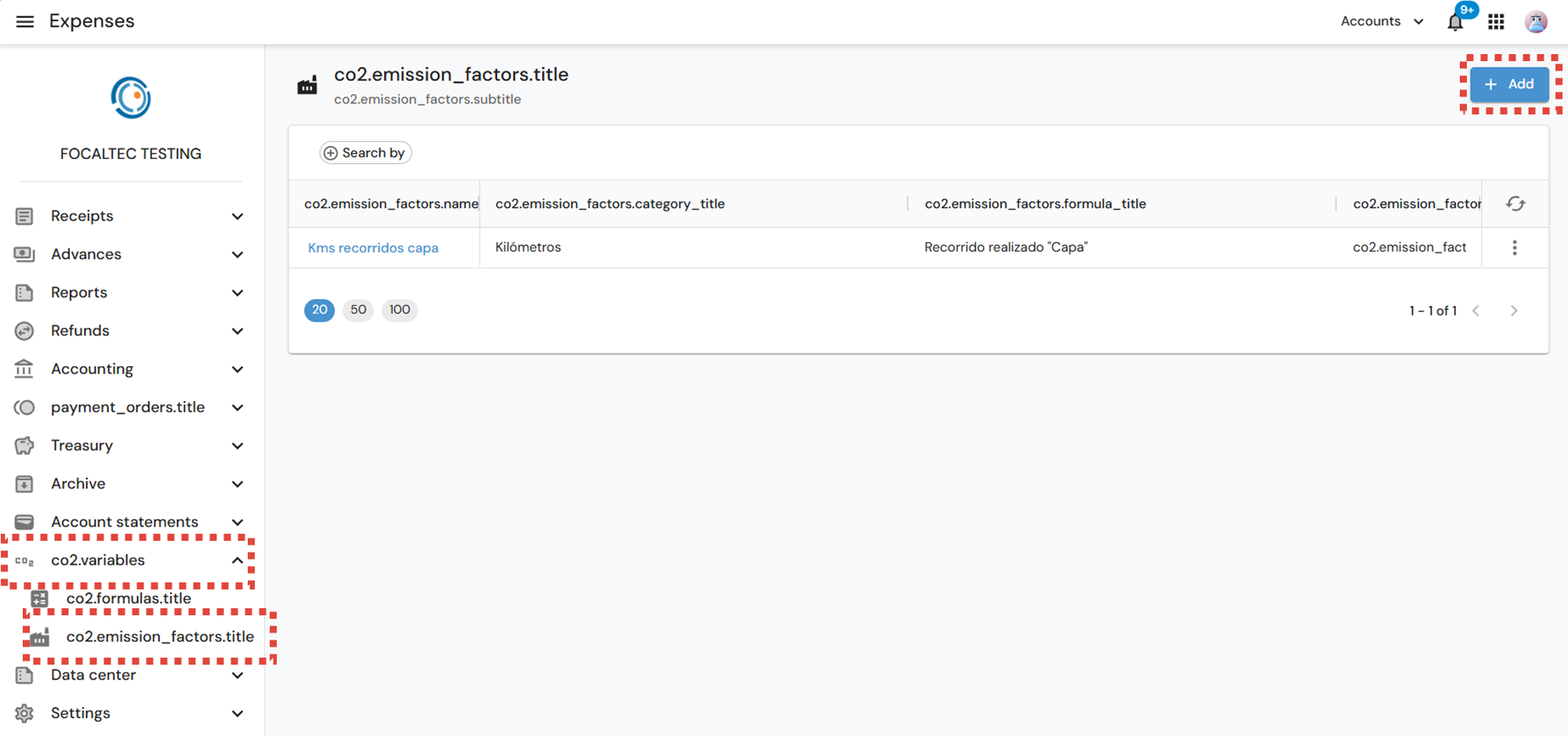 Log into the Focaltec Control de gastos portal and, in the “CO2 Variables > Emission Factors” menu, click on “+Add”.
