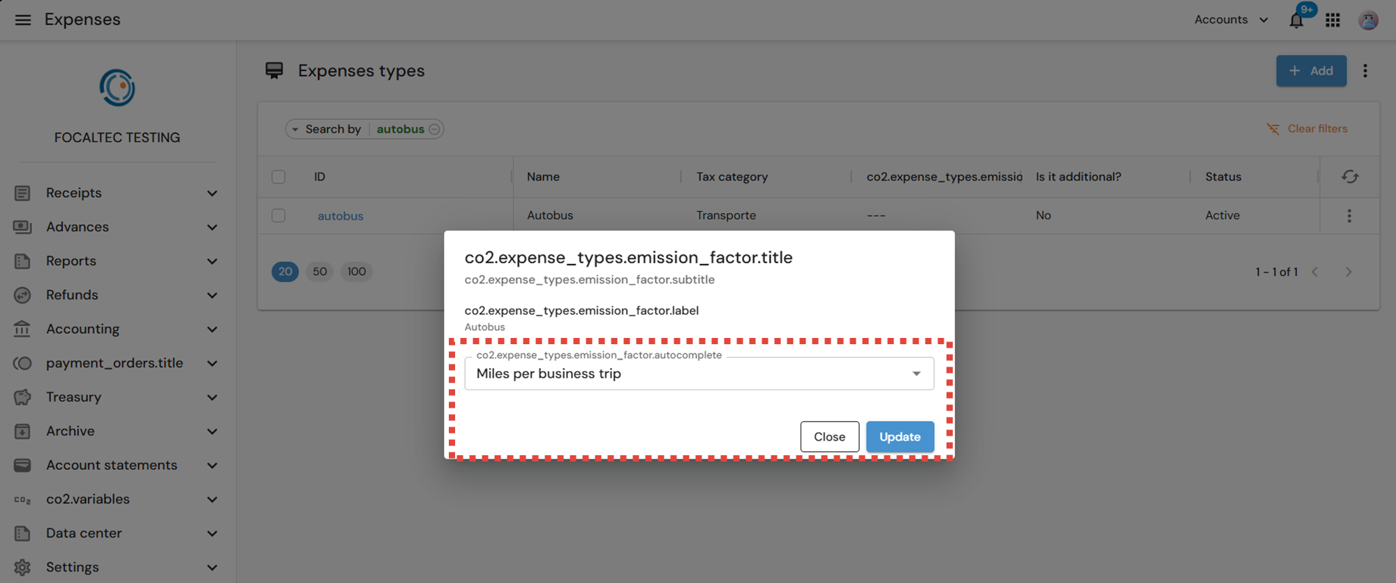 After configuring the “CO2 Variables” module, you will need to add the emission factor to an expense type that has already been created in the Focaltec Control de gastos portal.