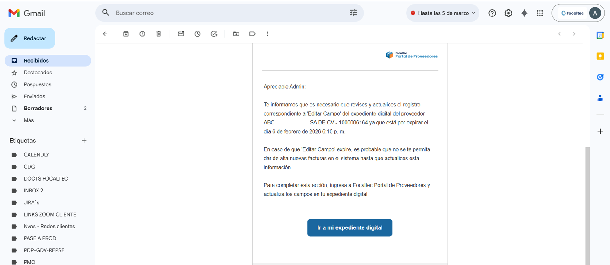 El proveedor recibirá por correo la notificación donde se le menciona la expiración de un campo dentro de su expediente digital.