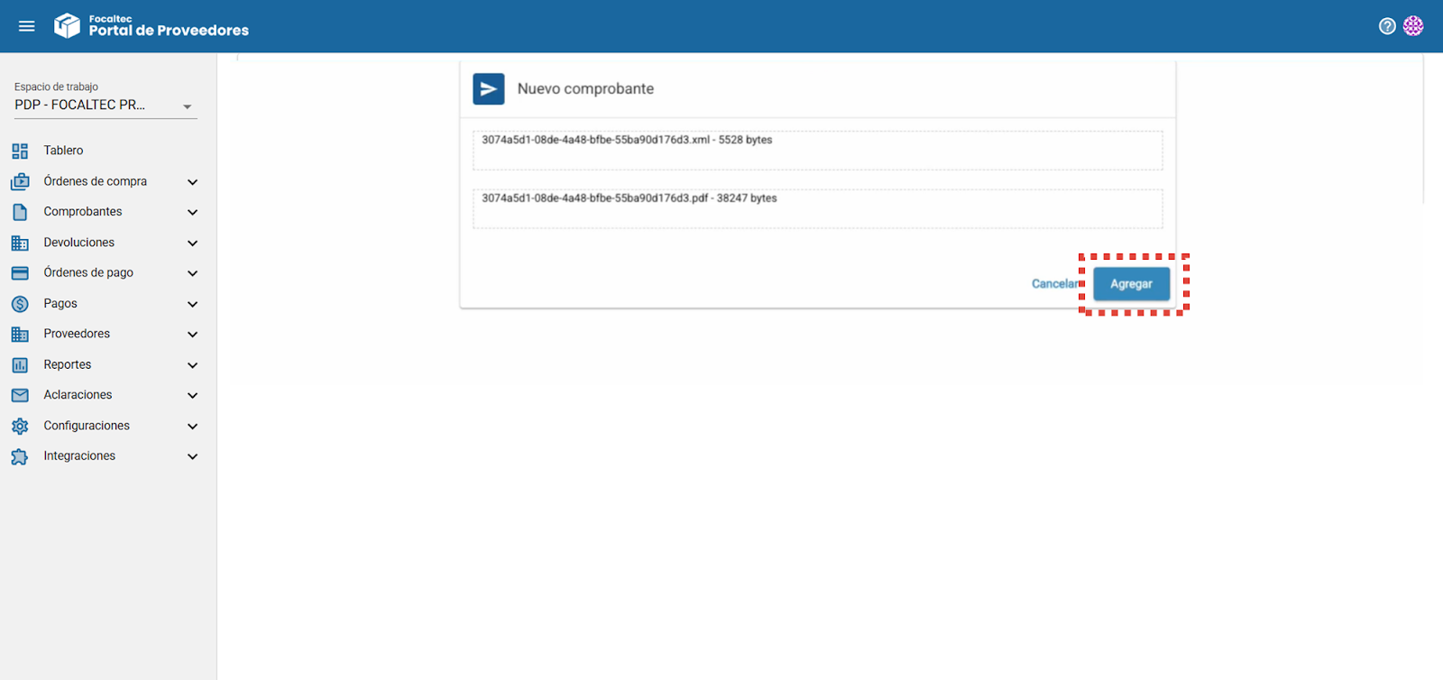 Para poder “Agregar una factura”, estando en el detalle de las facturas no cargadas al portal, dar clic en “+ Agregar”, observarás la ventana en la cual se encuentran los archivos de “XML - PDF”, dar clic en “Agregar”, se efectuarán validaciones y podrás continuar con tus actividades.