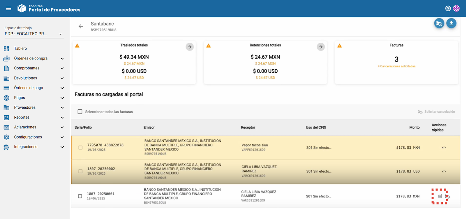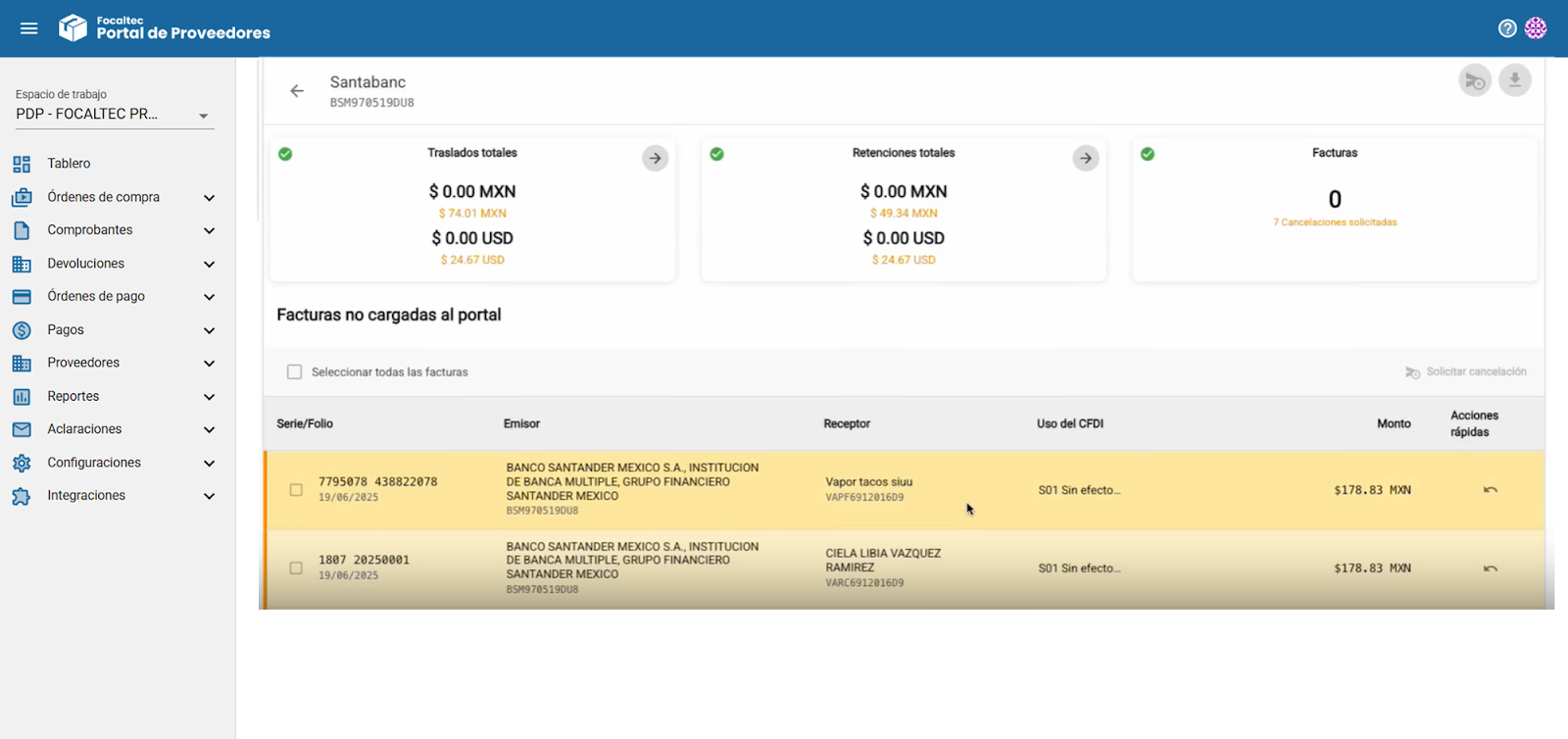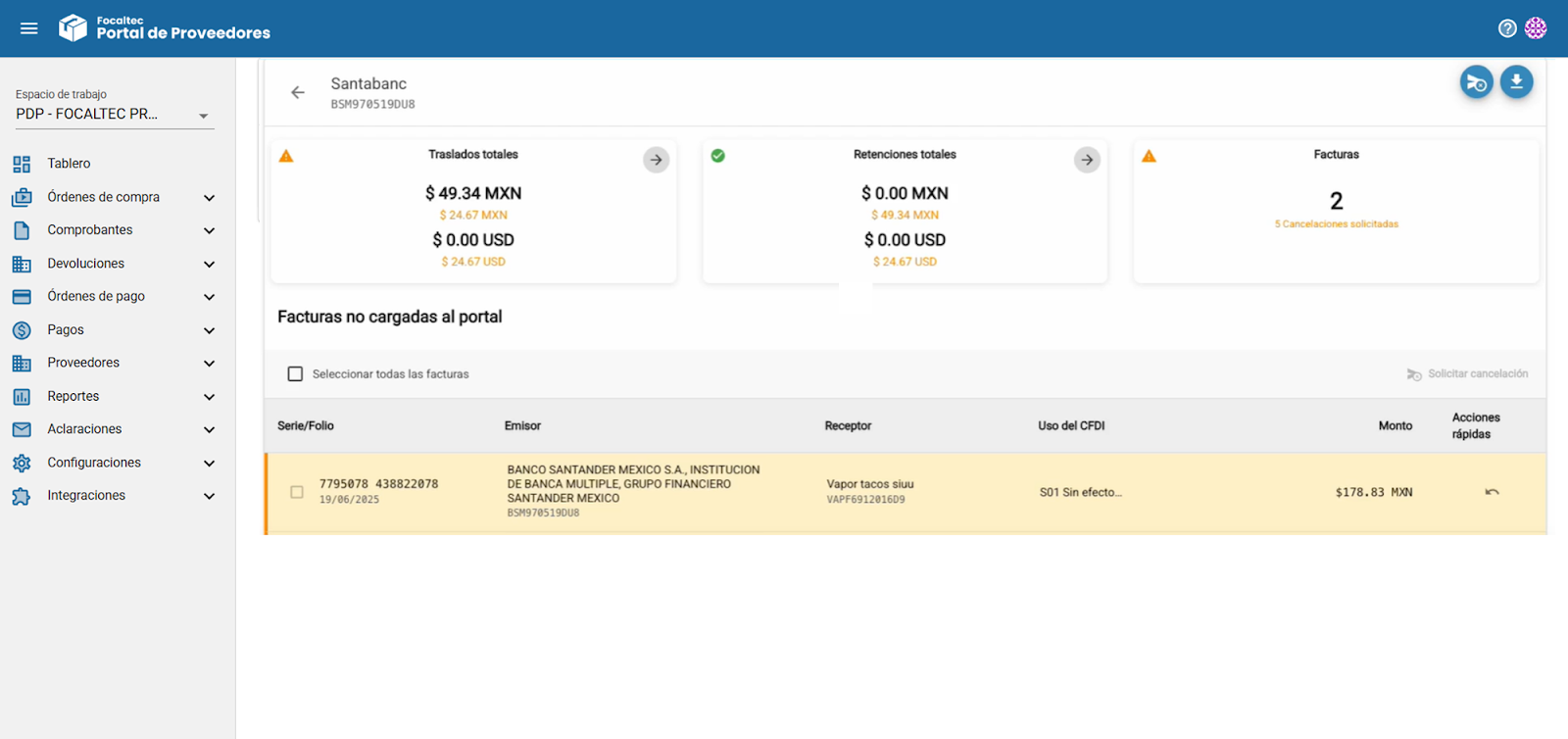 Facturas. Indica el total de facturas no cargadas del proveedor y muestra si existen solicitudes de cancelación relacionadas con esas facturas.