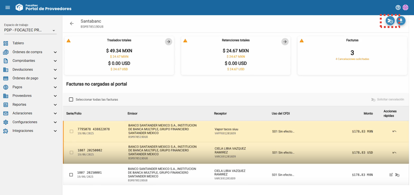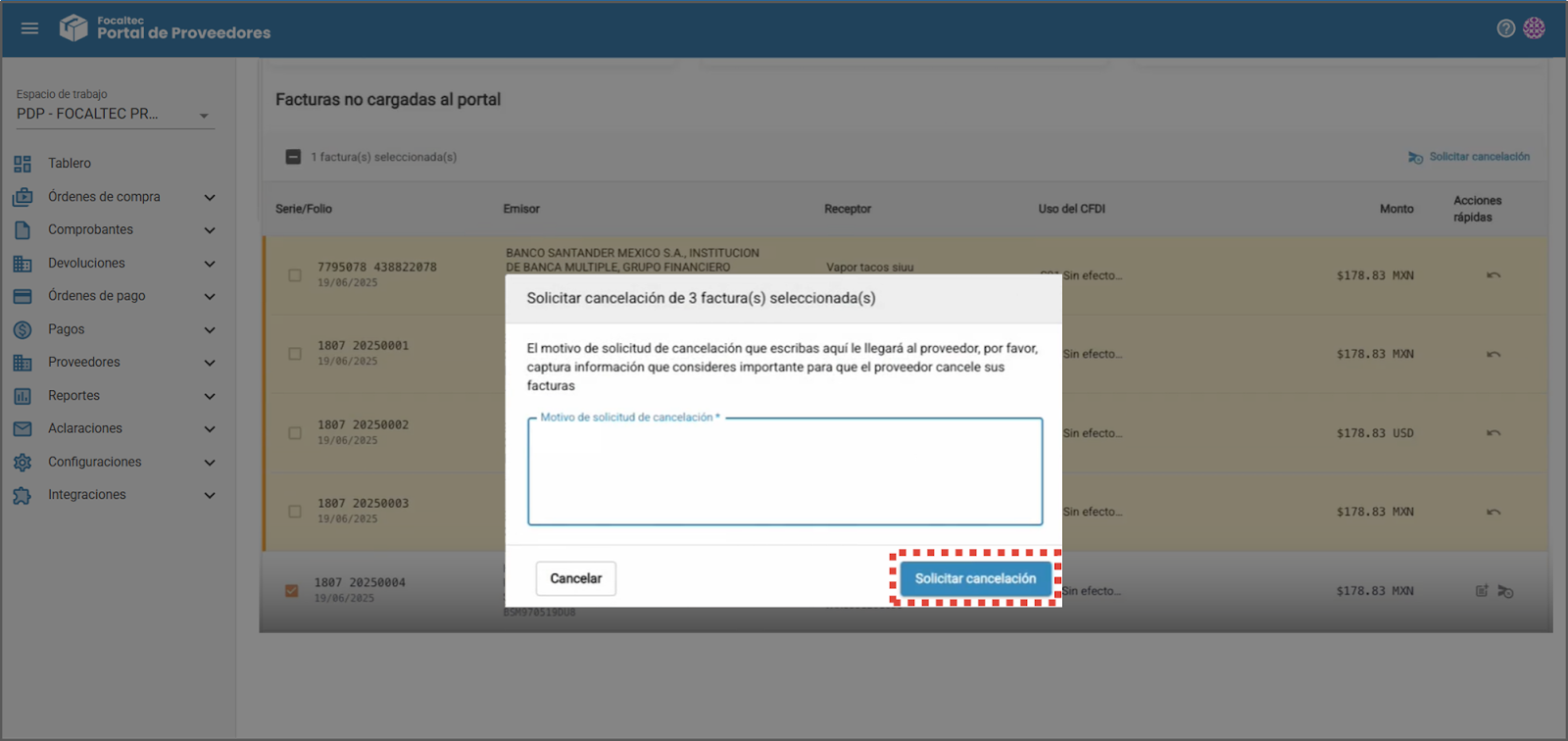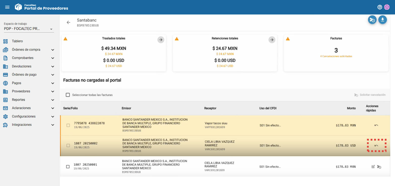 Facturas. Indica el total de facturas no cargadas del proveedor y muestra si existen solicitudes de cancelación relacionadas con esas facturas.