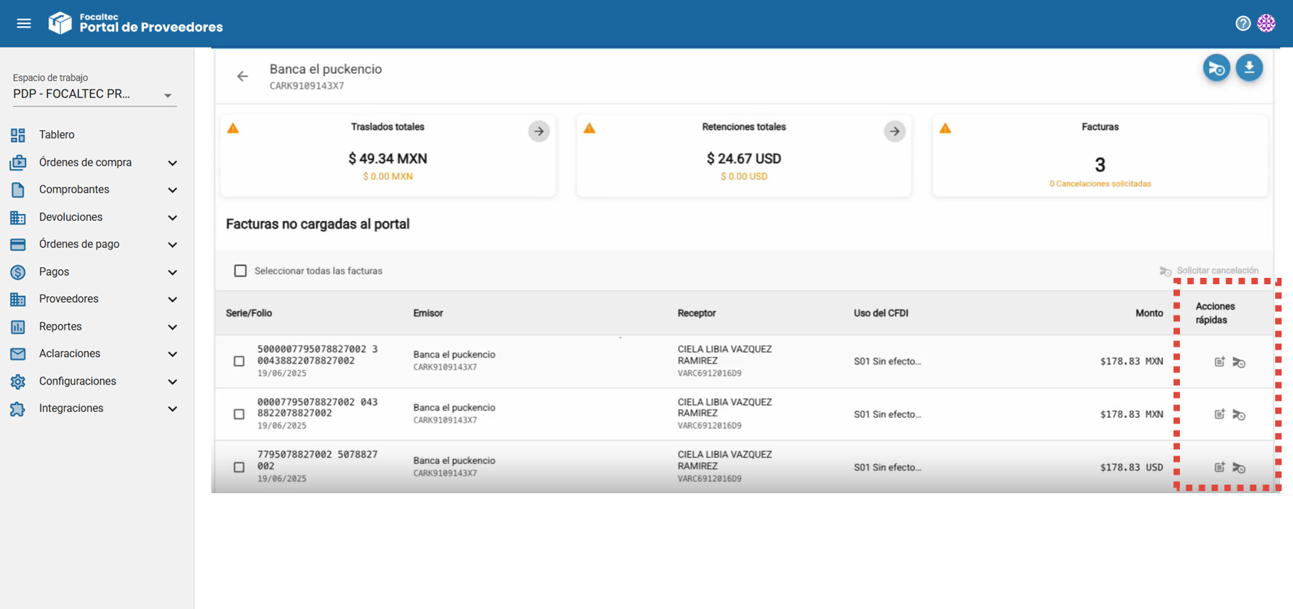 4. Estando en el detalle de las “Facturas no cargadas al portal” se pueden realizar alguna de las siguientes “Acciones rápidas”: