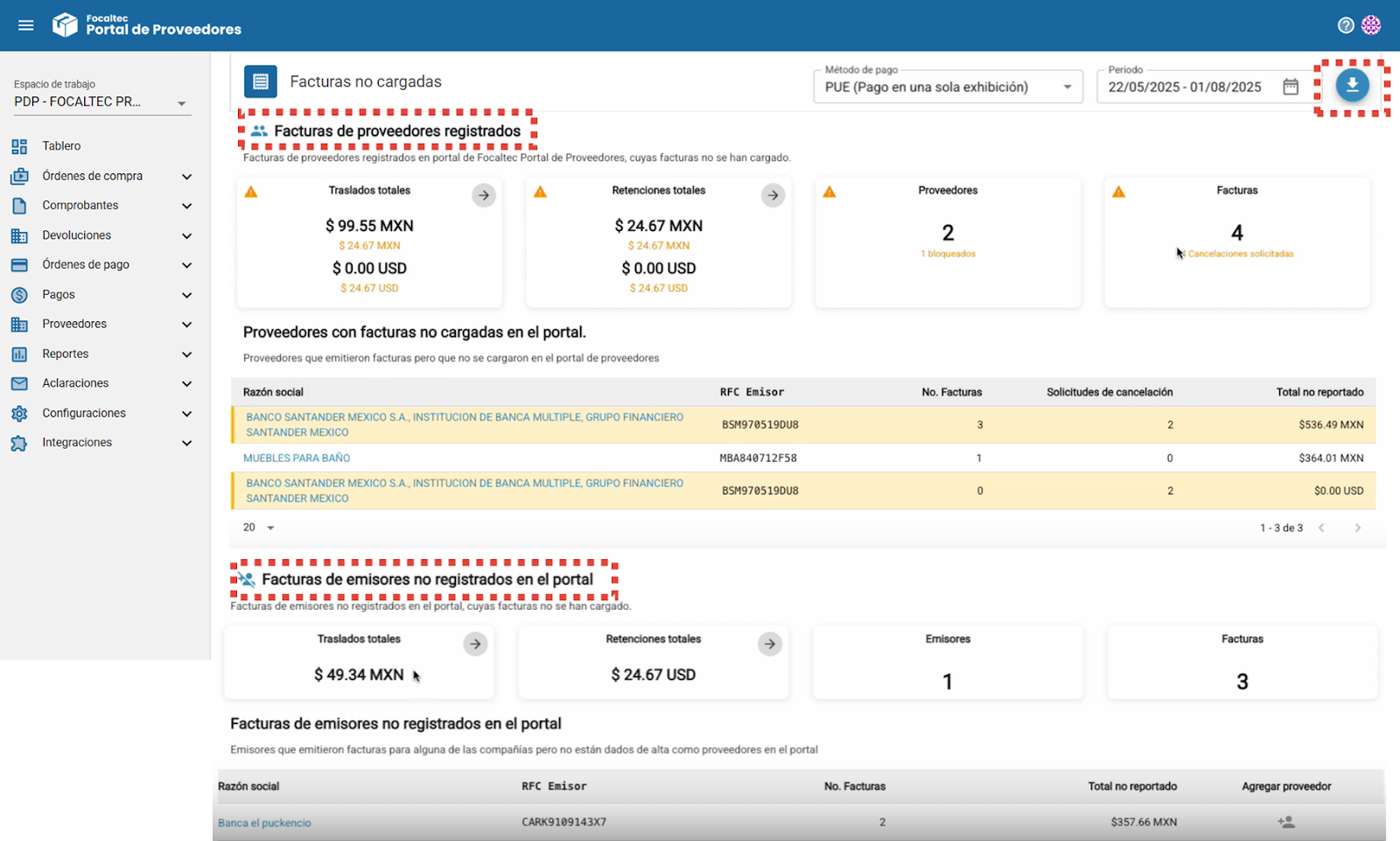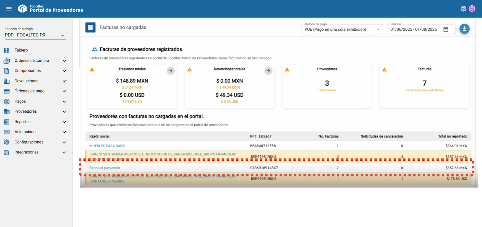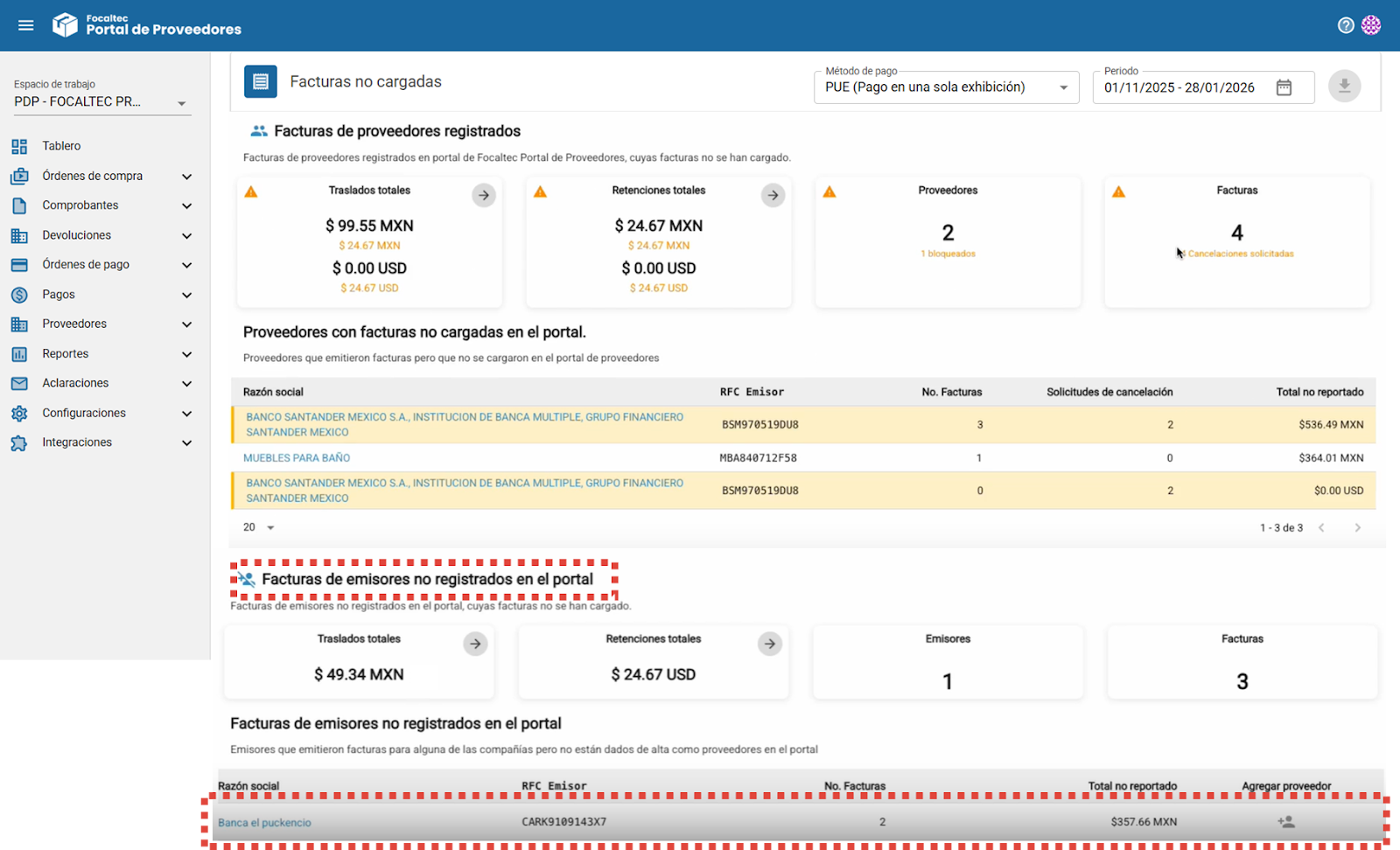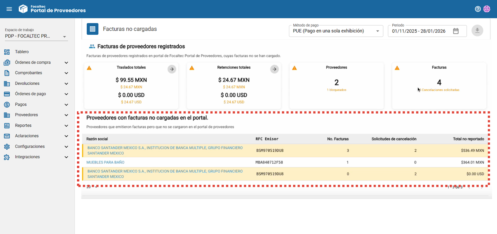 En la sección de “Proveedores con facturas no cargadas en el portal” se muestra el detalle de los proveedores que emitieron facturas, pero que aún no han sido cargadas en Focaltec Portal de Proveedores, así como una serie de información que describe: