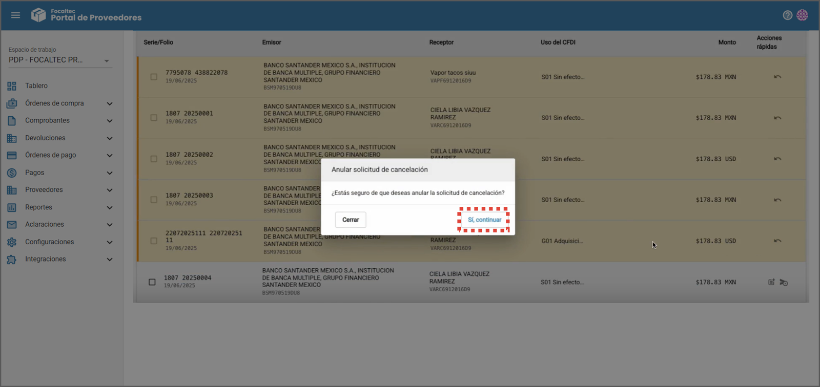 La última actividad adicional que puedes realizar desde “Facturas no cargadas al portal” es “Anular la solicitud de cancelación”, el portal antes de realizar la anulación se observa una alerta que indica “¿Estás seguro de que deseas anular la solicitud de cancelación?”, dar clic en “Si, continuar”, podrás ver ajustes en la información de “Traslados totales, Retenciones totales y Facturas”.