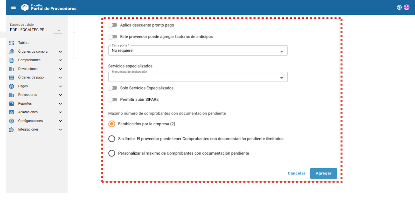 Agregar proveedor. Opción que permite iniciar el proceso paladar de alta al emisor como proveedor en el portal.