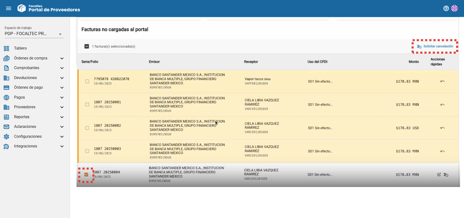 Acciones rápidas: Opciones disponibles para la factura, como: Anular solicitud de cancelación, Agregar factura y Solicitar cancelación.