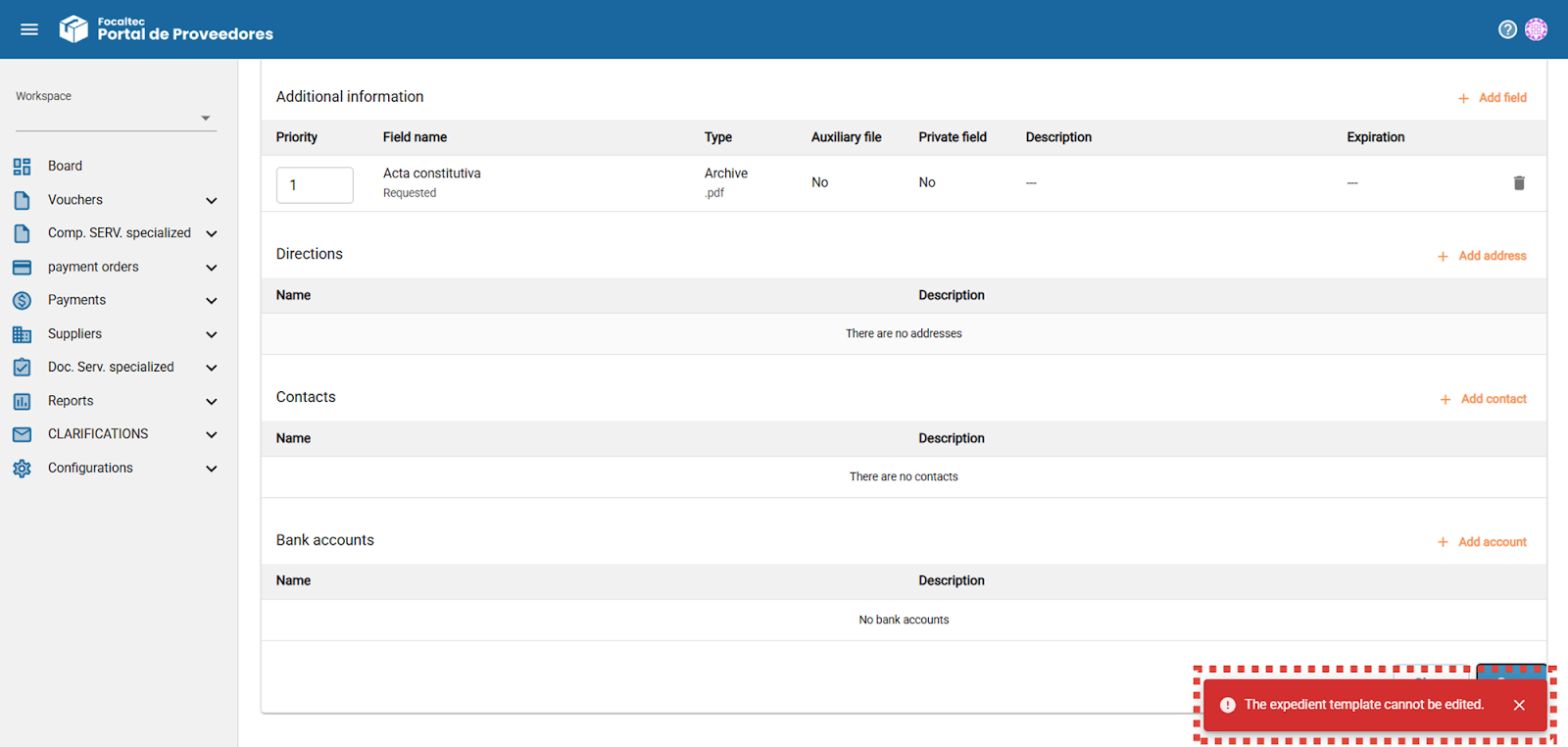 In this list, you can see a template named “No record”, this template is created automatically and can be assigned to a supplier for whom no information is required in order to perform activities within the Focaltec Portal de proveedores.