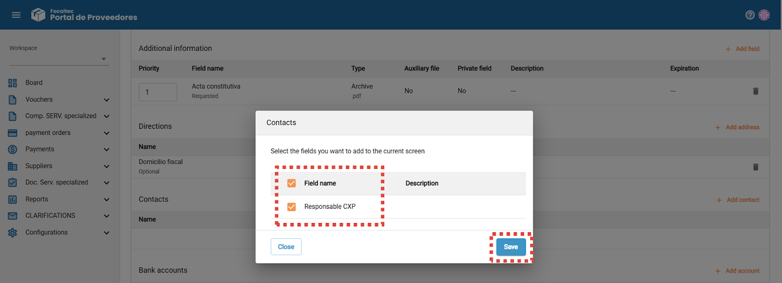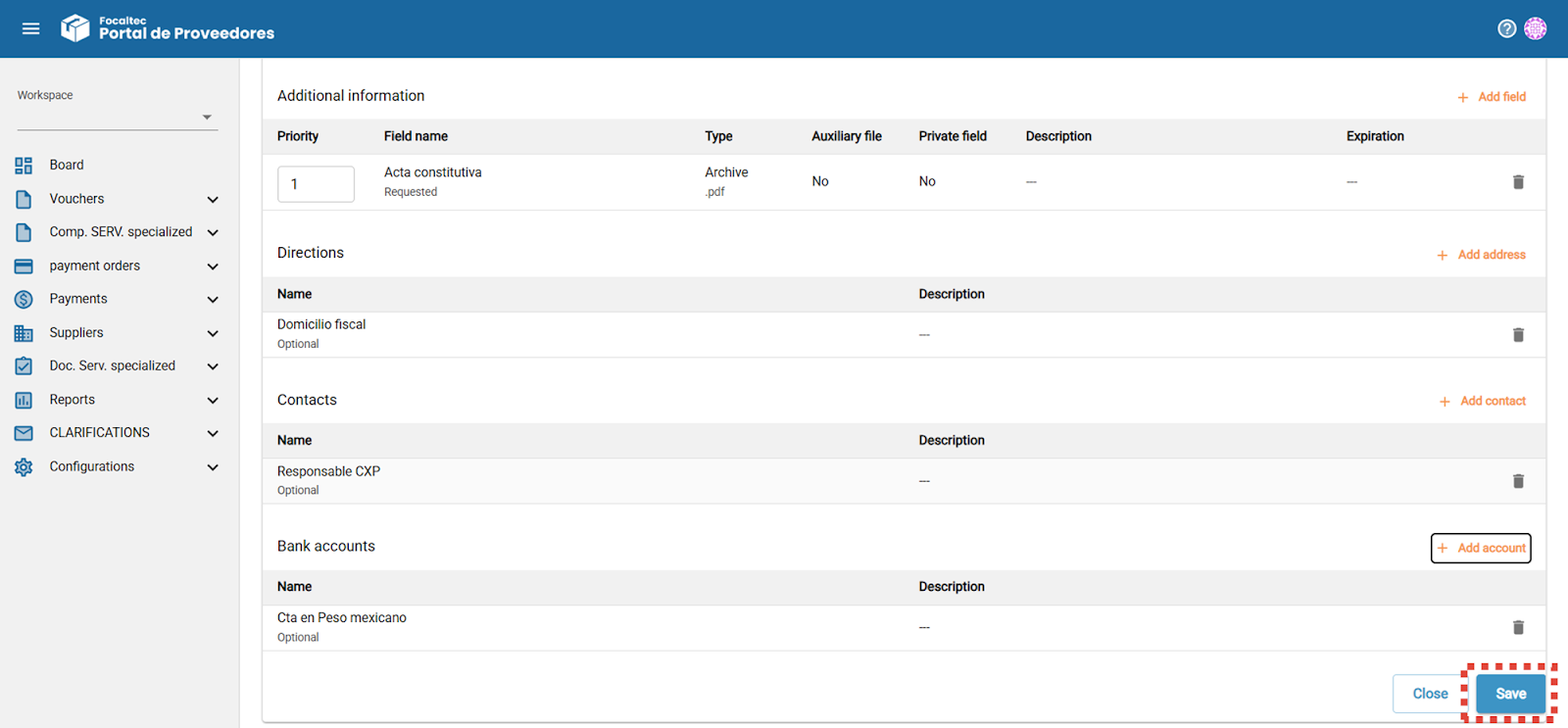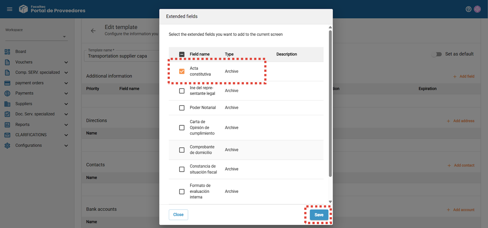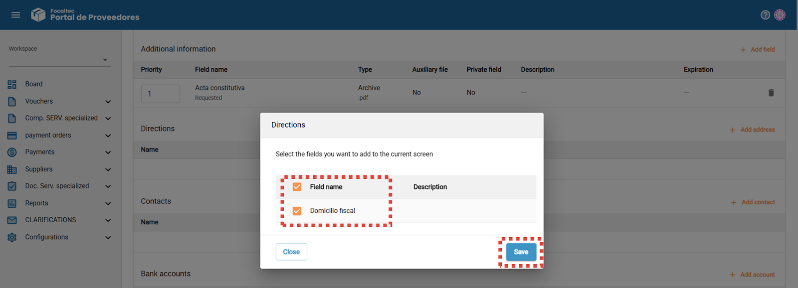 Additional information “+ Add field”. Allows you to select the information to be requested from the Supplier from a list of documents, click “Save”.