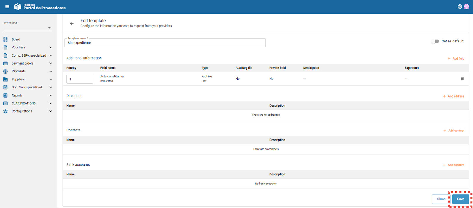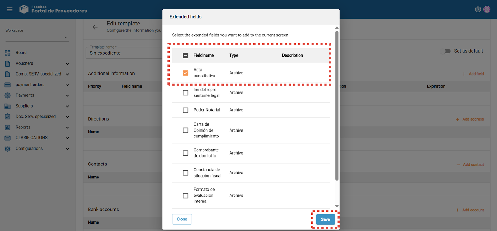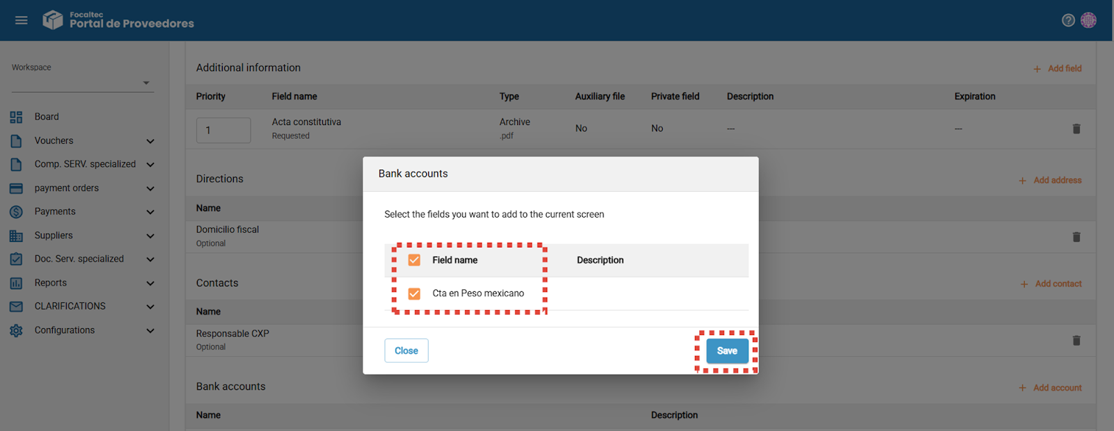 Additional information “+ Add field”. Allows you to select the information to be requested from the Supplier from a list of documents, click “Save”.
