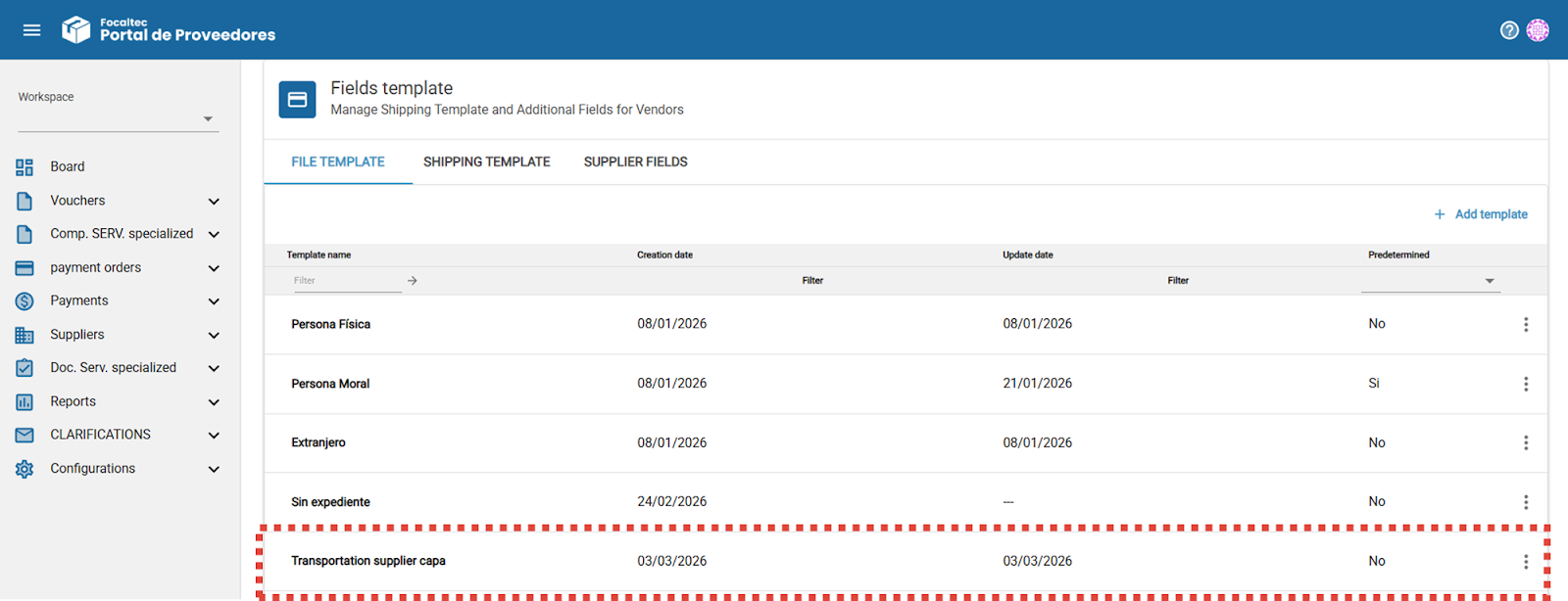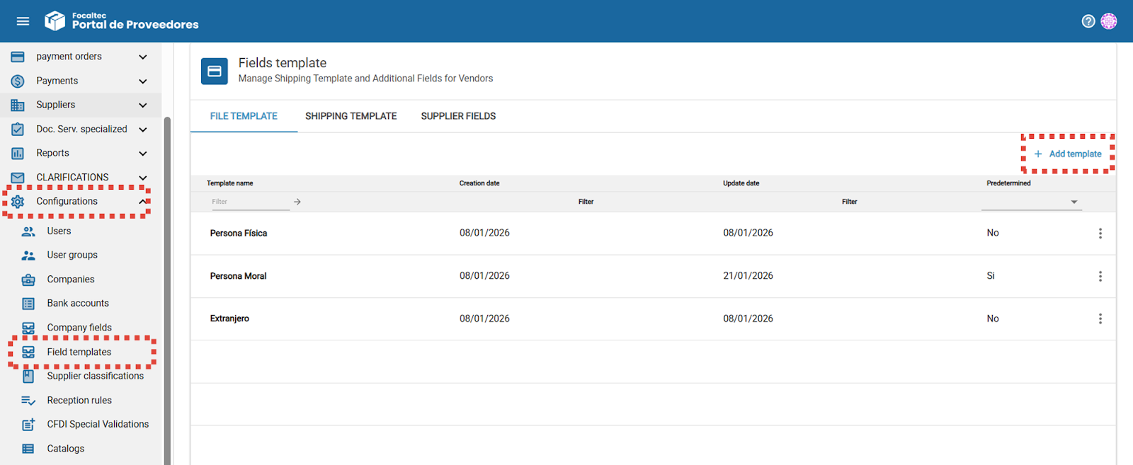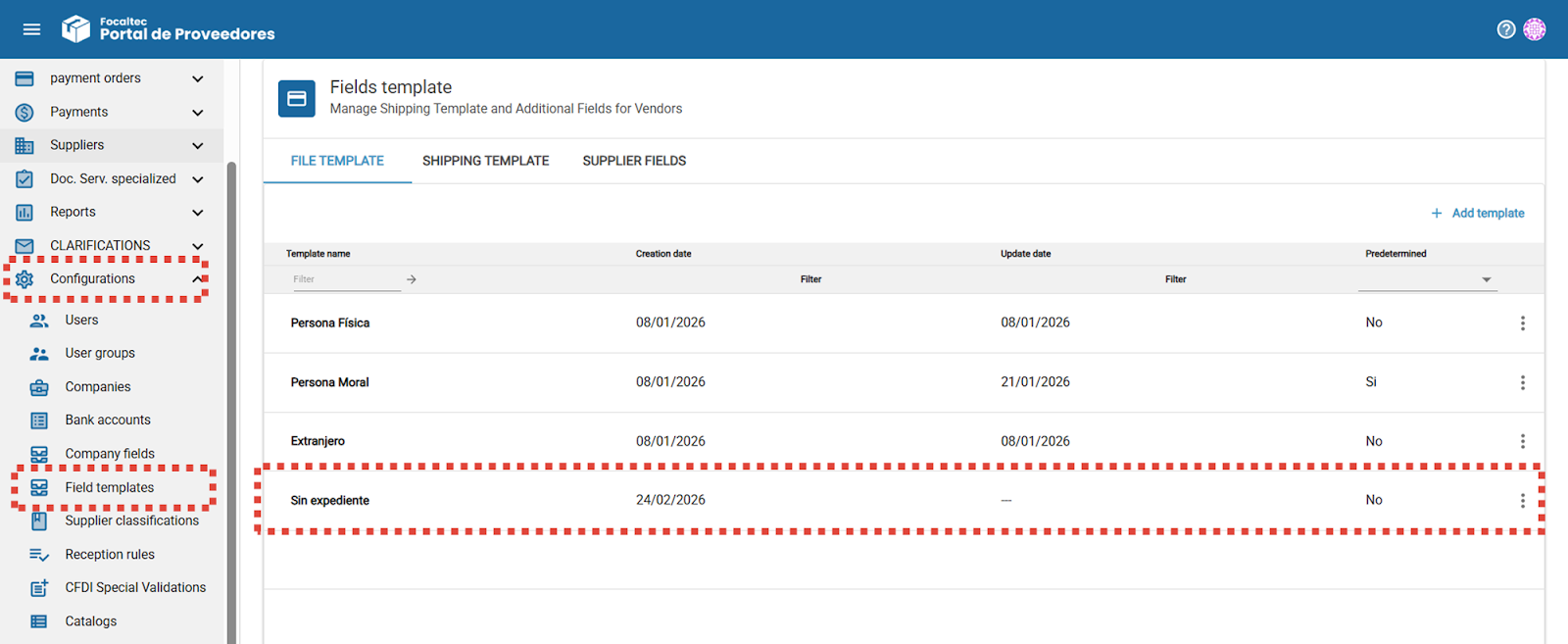 From the “Configurations > Field templates” menu, the Administrator can view the list of File Templates that have been created and can be assigned to the Supplier.
