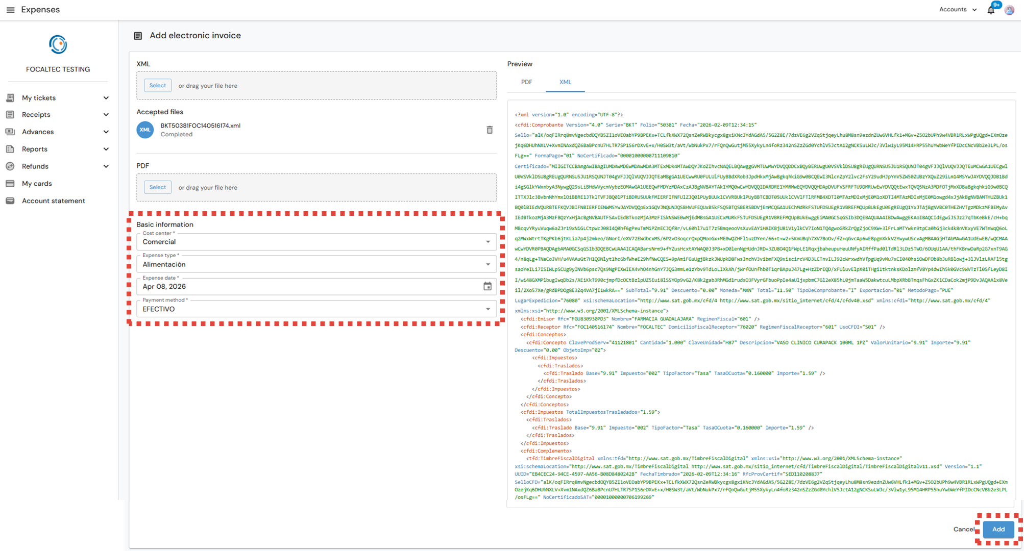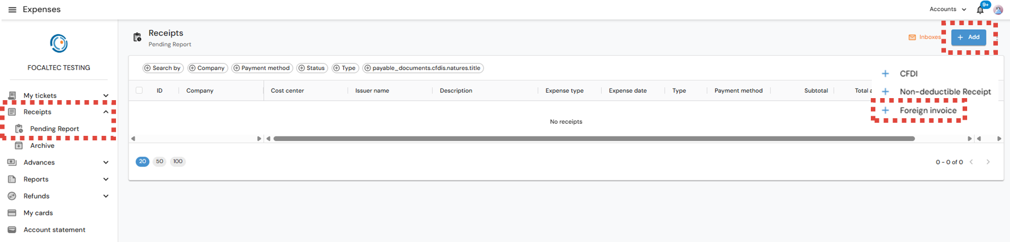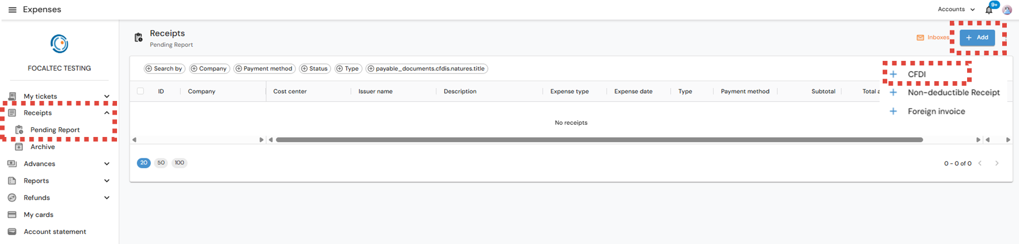 After logging in to Focaltec Control de gastos, the User must click on the Menu “Receipts > Pending Report”; the list of receipts already registered will be in view, now click on “+ Add > CFDI”.