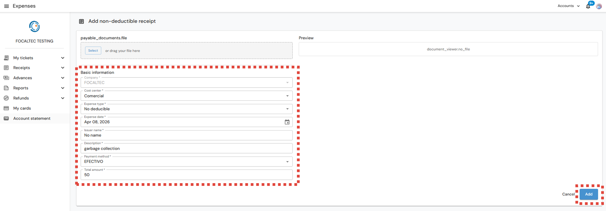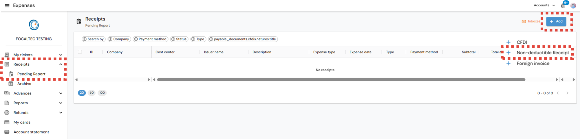 After logging in to Focaltec Control de gastos, the User must click on the Menu “Receipts > Pending Report”; the list of receipts already registered will be in view, now click on “+ Add > Non-deductible receipt”.