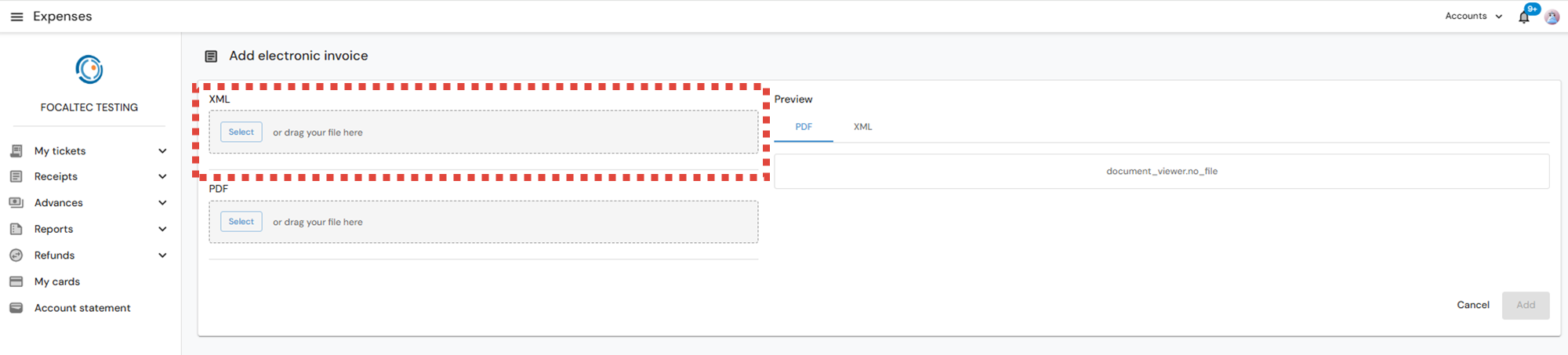 Upload your XML by clicking the "Select" button (Once the portal validations are met, you can consult the XML information in the Preview space).