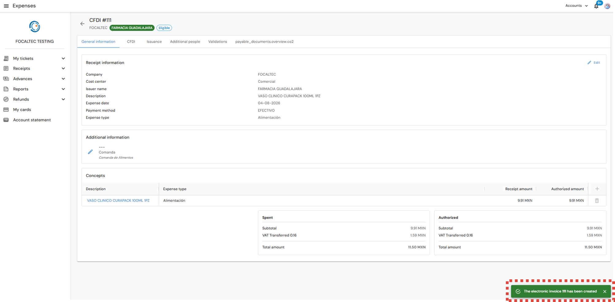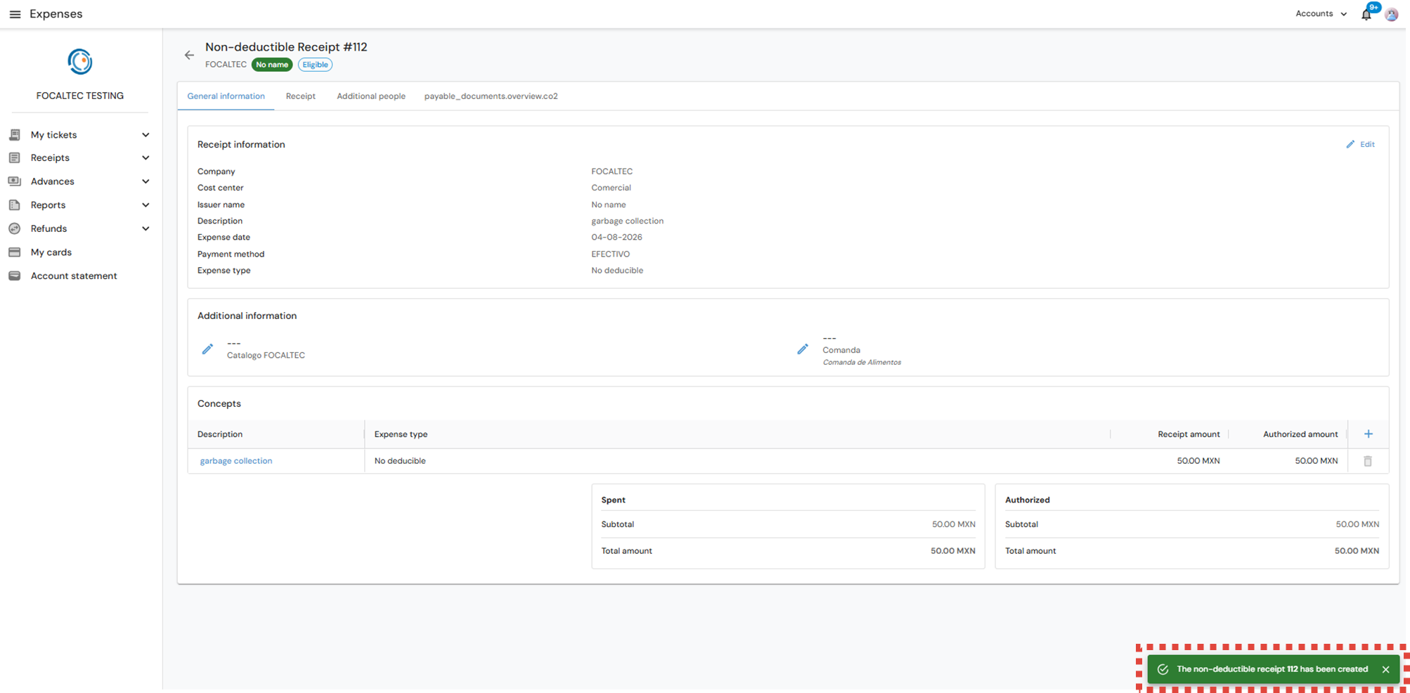 The portal issues an alert notifying “The non - deductible receipt xxx has been created”, you can also observe in the upper part the receipt status “Eligible to Draft”. If the status is “Draft”, you must add the additional information requested by the company.