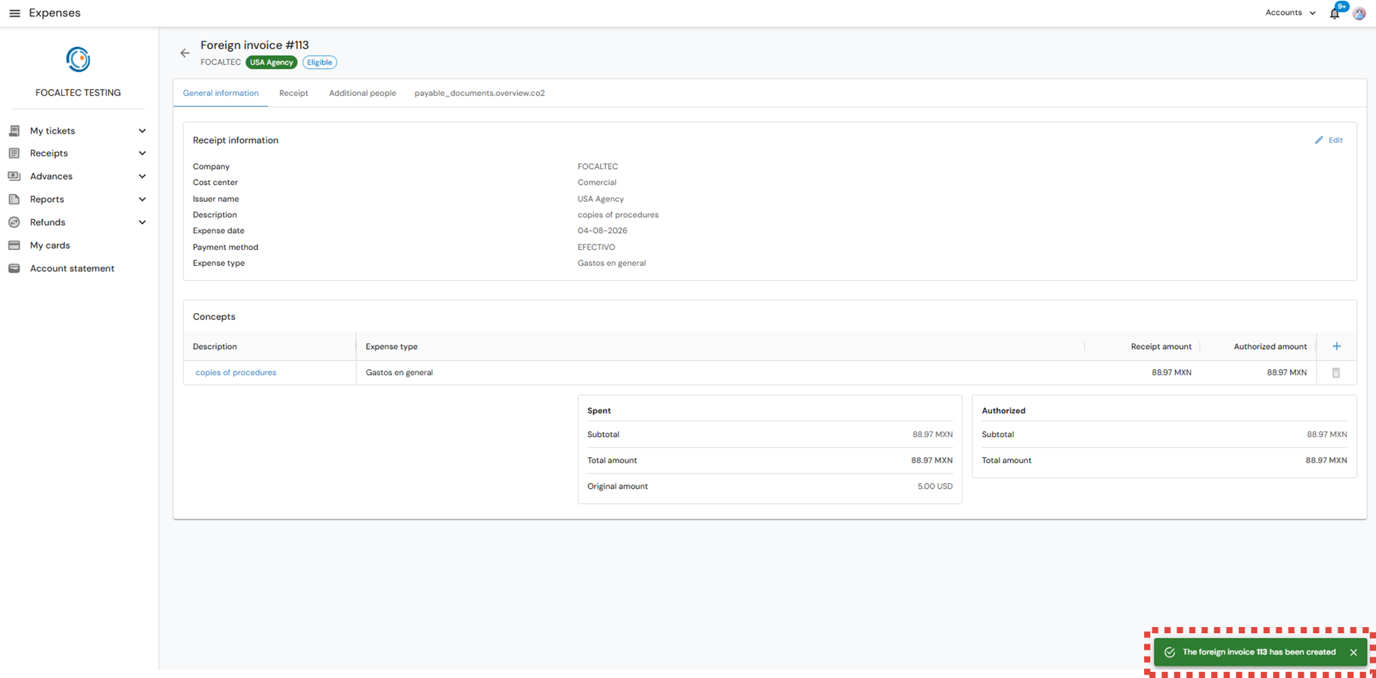The portal issues an alert notifying “The foreign invoice xxx has been created”, you can also observe in the upper part the receipt status “Eligible to Draft”.
