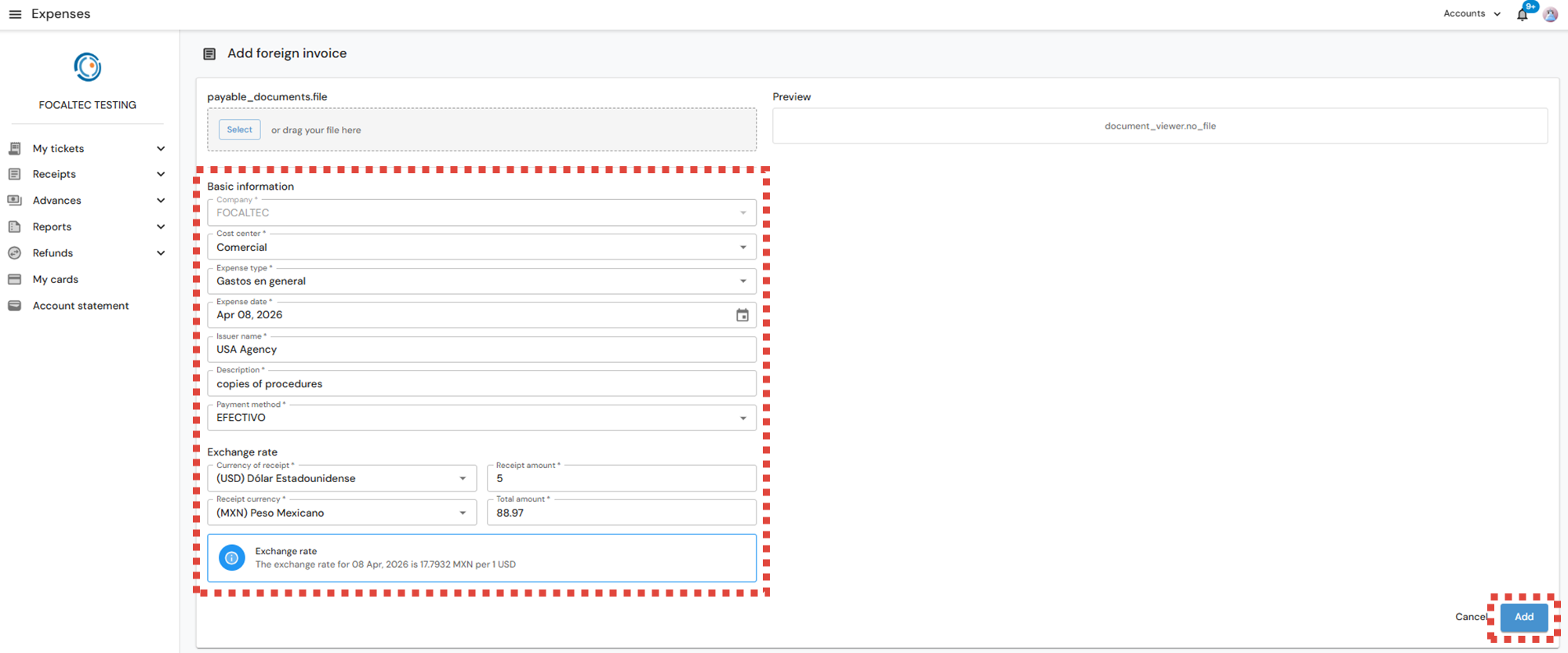 After logging in to Focaltec Control de gastos, the User must click on the Menu “Receipts > Pending Report”; the list of receipts already registered will be in view, now click on “+ Add > Foreign invoice”.